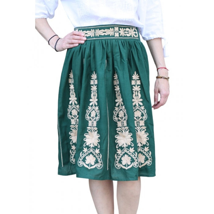 Fusta cu model traditional romanesc brodat la masina, cu elastic in talie, necaptusita, din bumbac 100%.