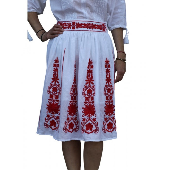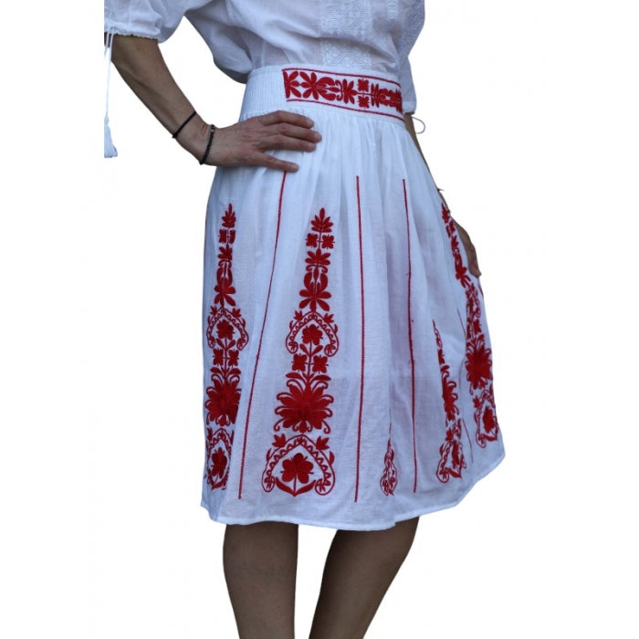 Fusta cu model traditional romanesc brodat la masina, cu elastic in talie, necaptusita, din bumbac 100%.