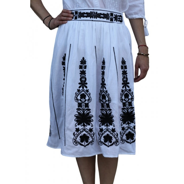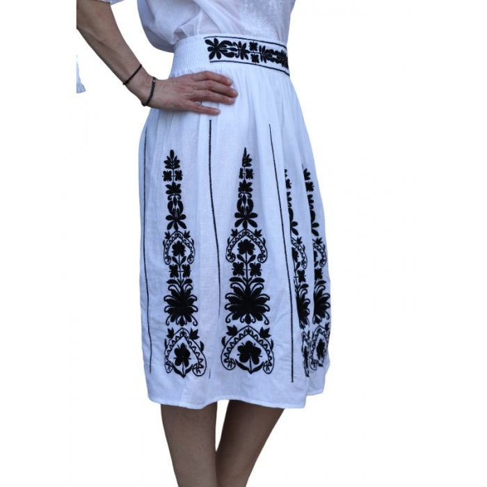 Fusta cu model traditional romanesc brodat la masina, cu elastic in talie, necaptusita, din bumbac 100%.