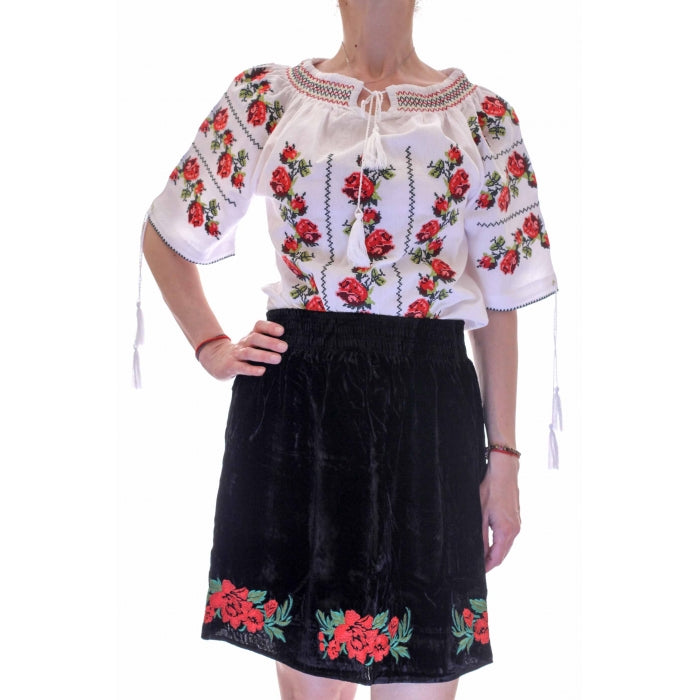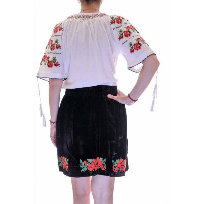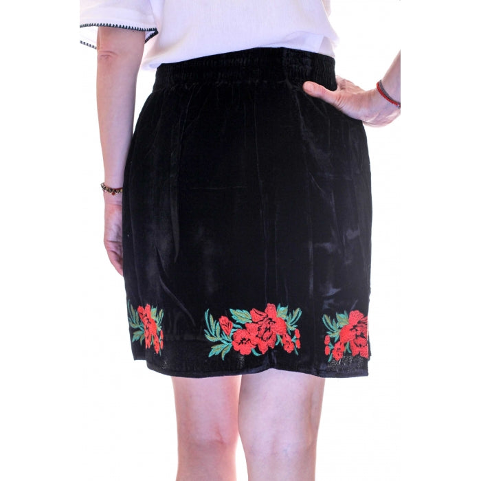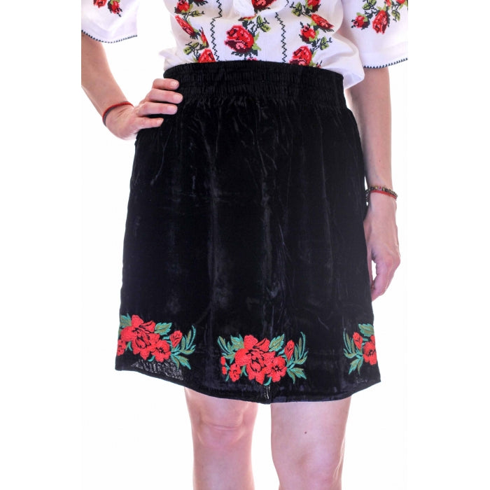 Fusta cu model traditional romanesc brodat la masina, cu elastic in talie, jupa la interior, material catifea.