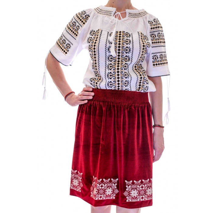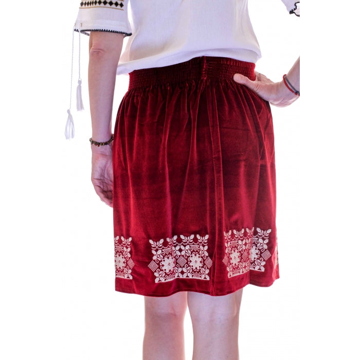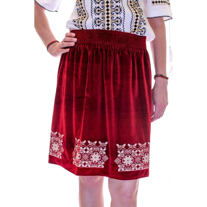 Fusta cu model traditional romanesc brodat la masina, cu elastic in talie, jupa la interior, material catifea.