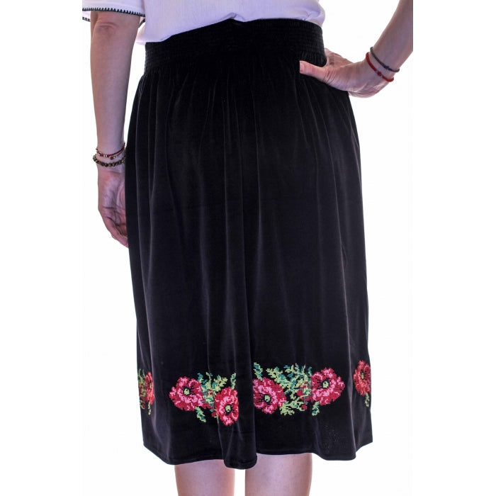 Fusta cu model traditional romanesc brodat la masina, cu elastic in talie, jupa la interior, material catifea.