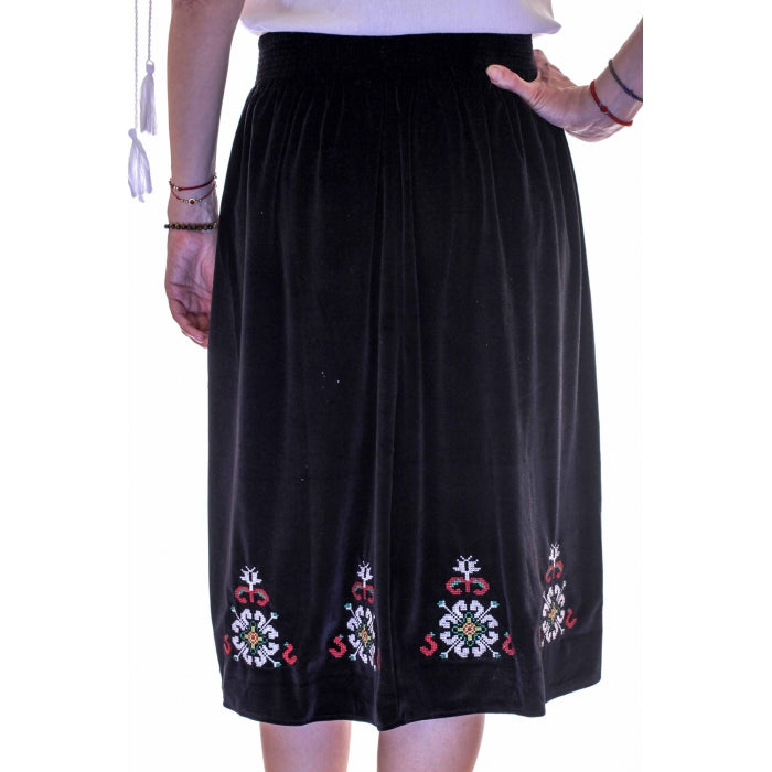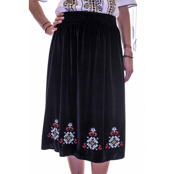 Fusta cu model traditional romanesc brodat la masina, cu elastic in talie, jupa la interior, material catifea.