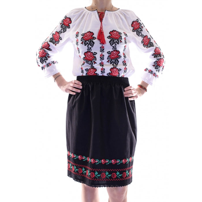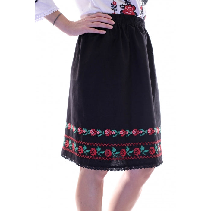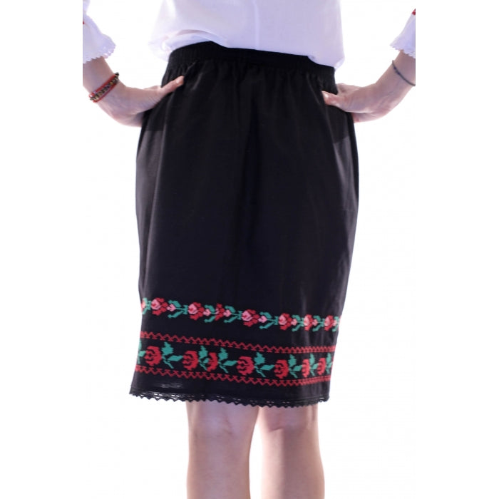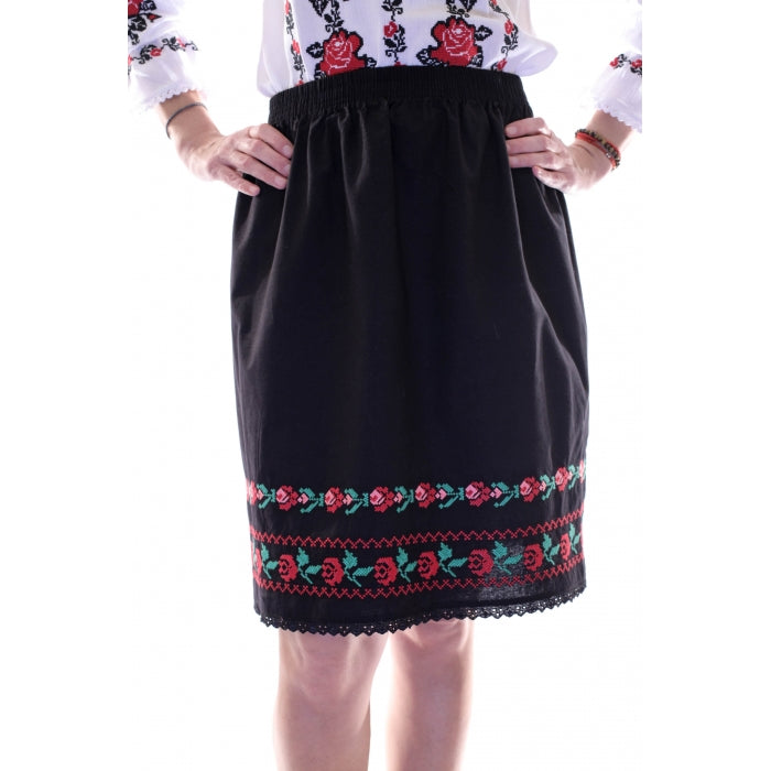 Fusta cu model traditional romanesc brodat la masina, cu elastic in talie, necaptusita, din bumbac 100%.