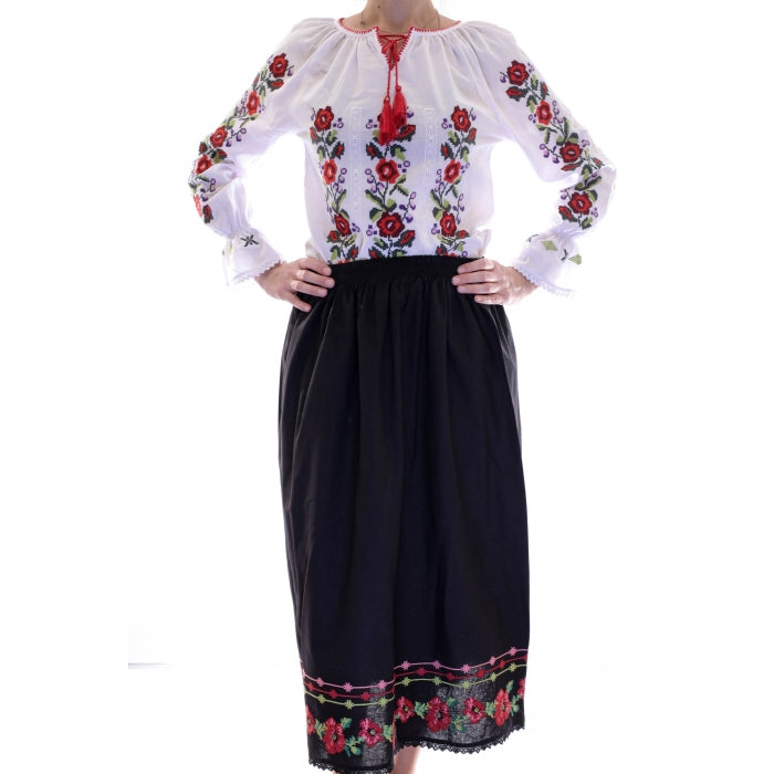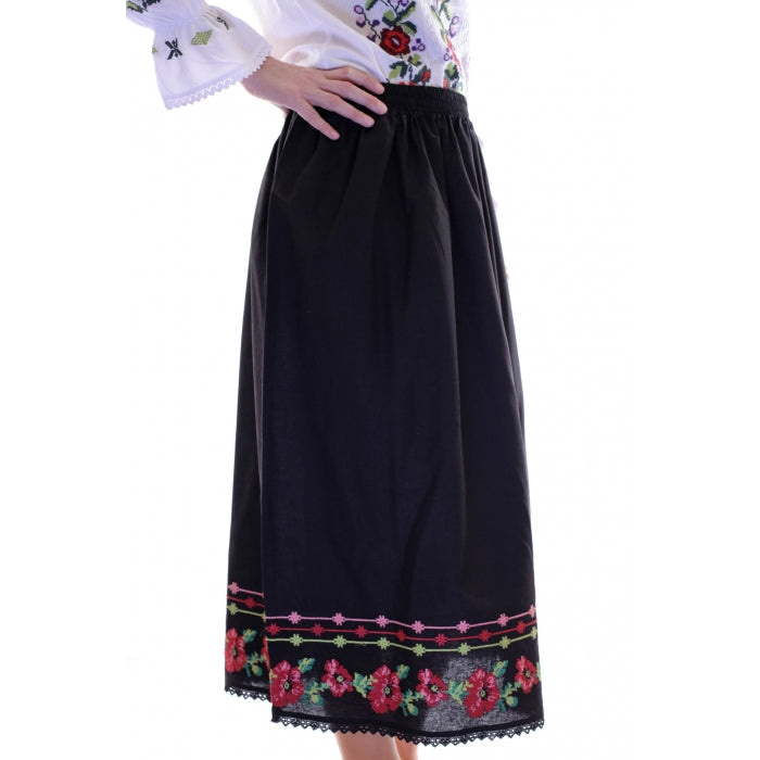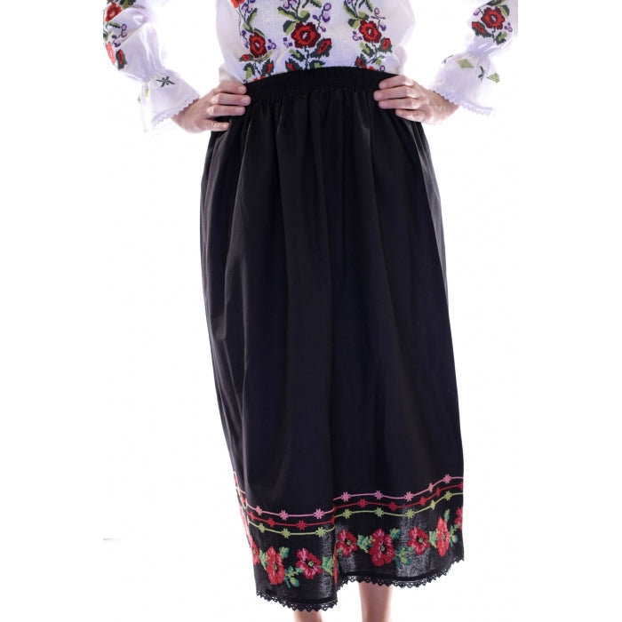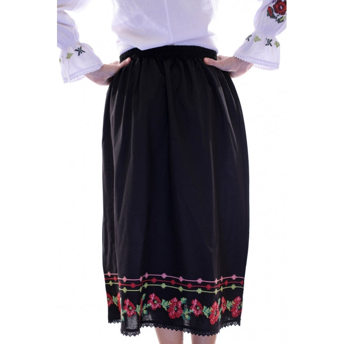 Fusta cu model traditional romanesc brodat la masina, cu elastic in talie, necaptusita, din bumbac 100%.