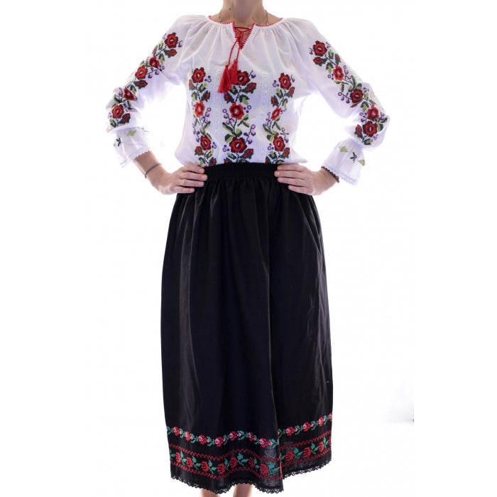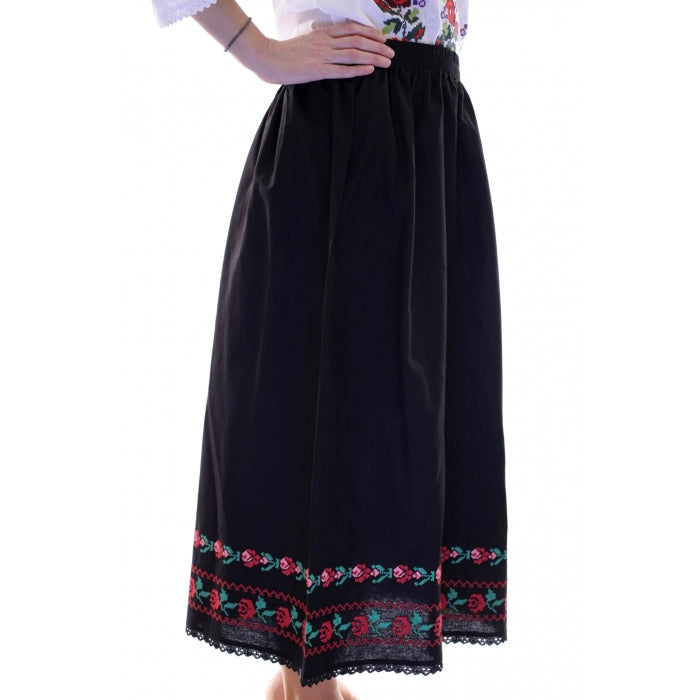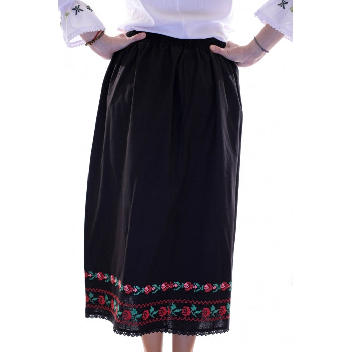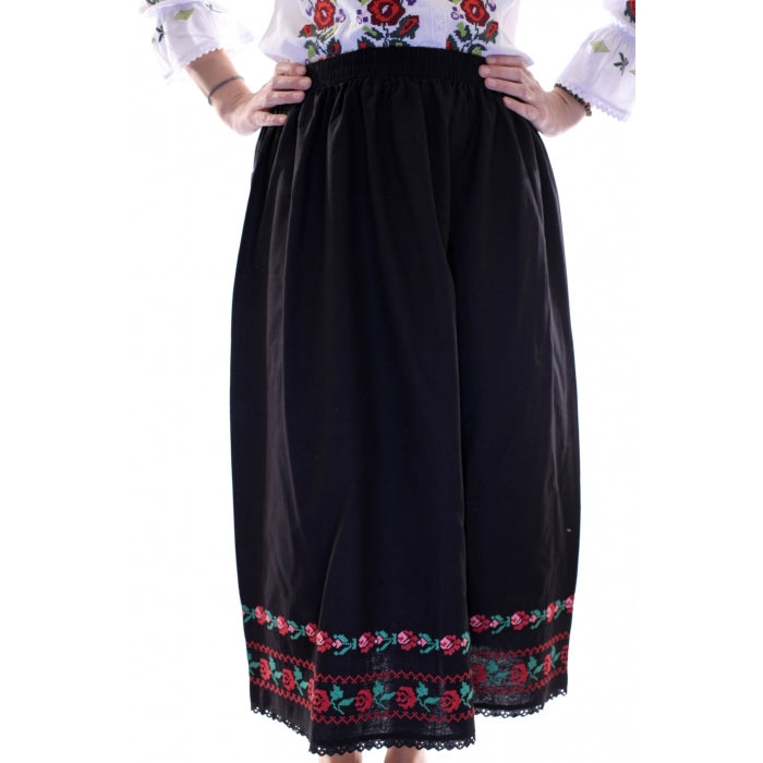 Fusta cu model traditional romanesc brodat la masina, cu elastic in talie, necaptusita, din bumbac 100%.