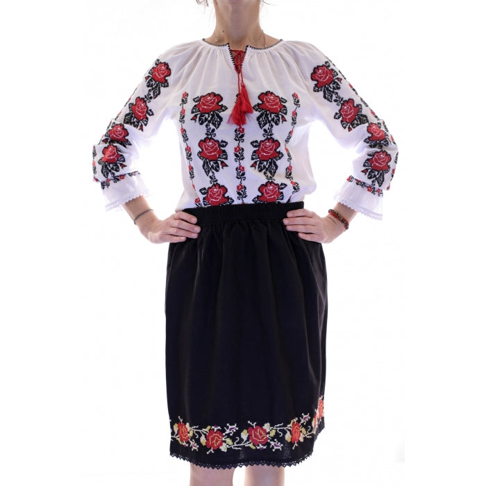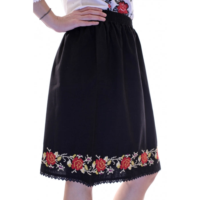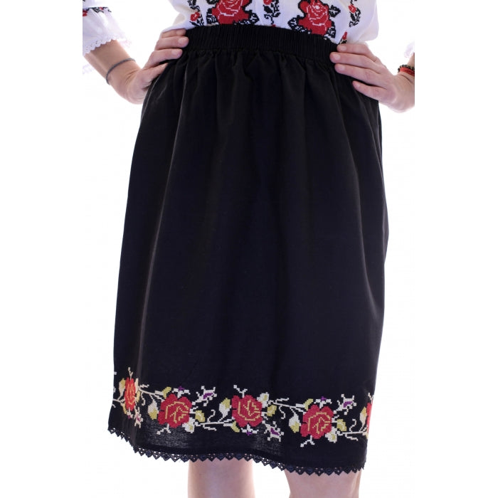 Fusta cu model traditional romanesc brodat la masina, cu elastic in talie, necaptusita, din bumbac 100%.