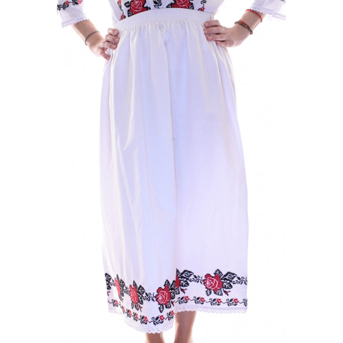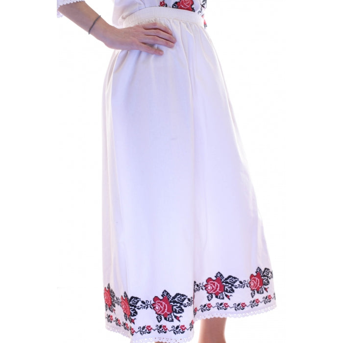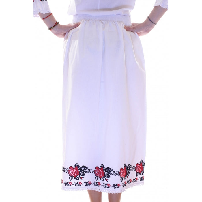 Fusta cu model traditional romanesc brodat la masina, cu elastic in talie, necaptusita, din bumbac 100%.