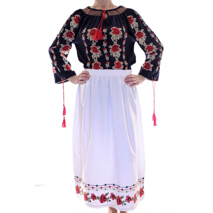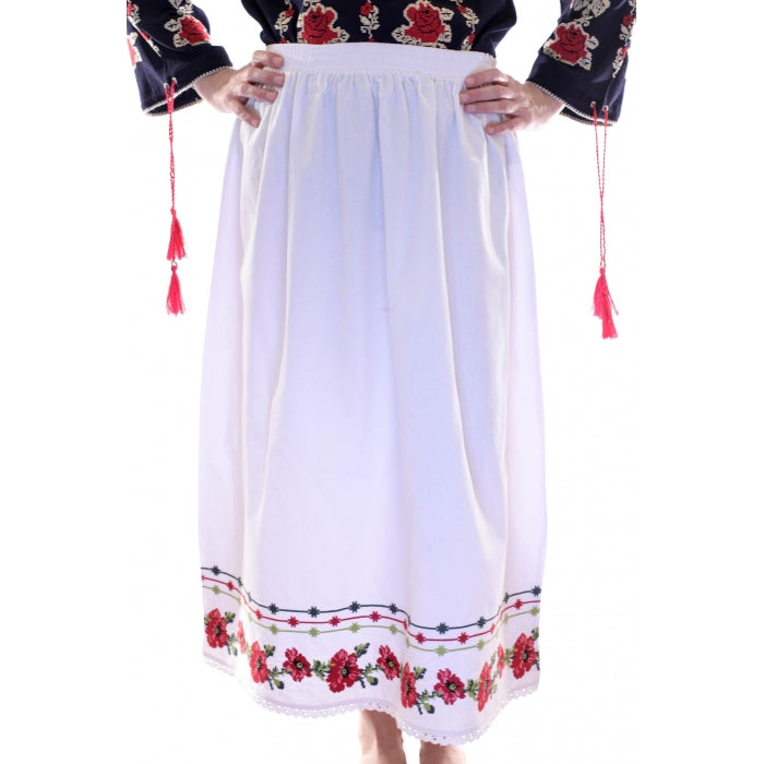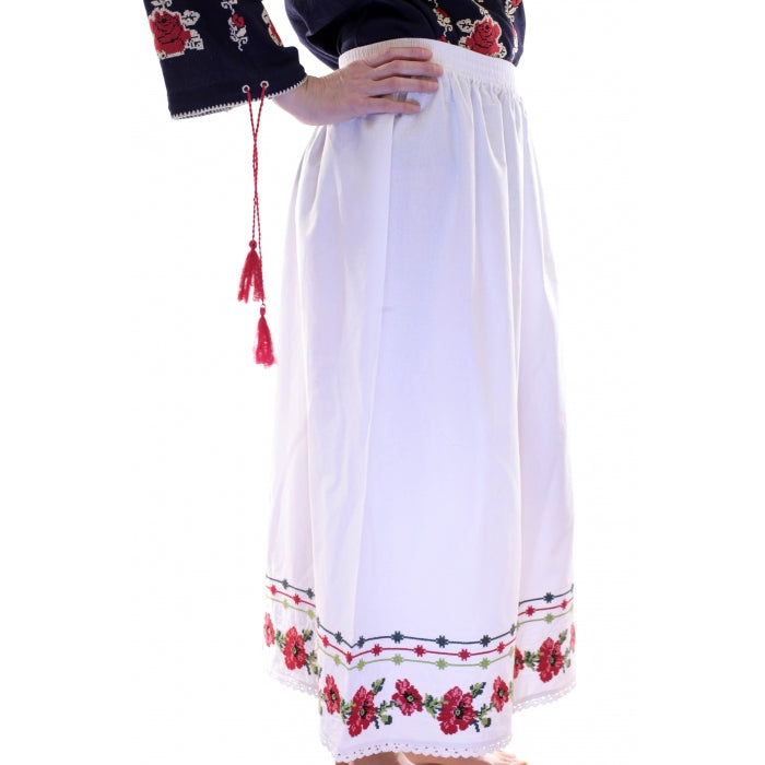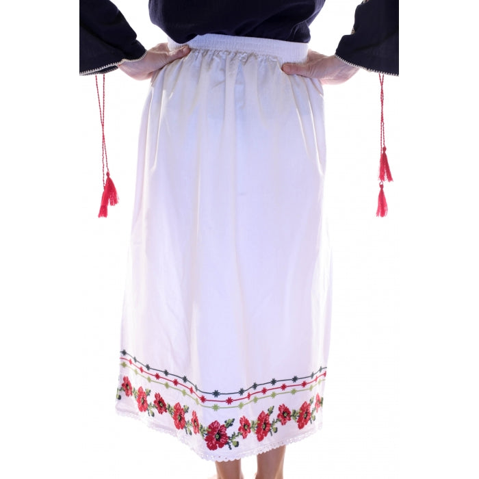 Fusta cu model traditional romanesc brodat la masina, cu elastic in talie, necaptusita, din bumbac 100%.