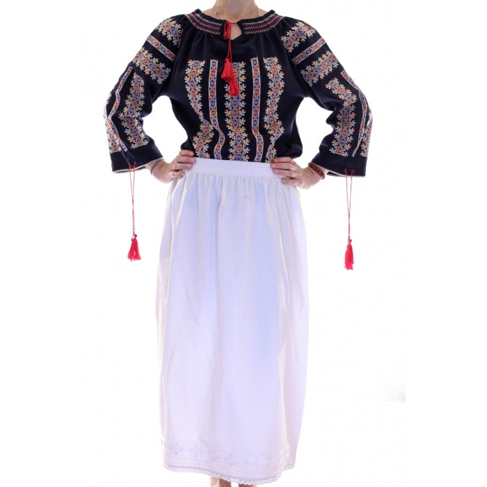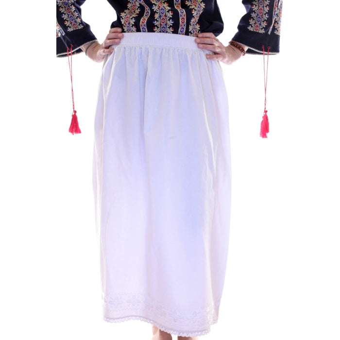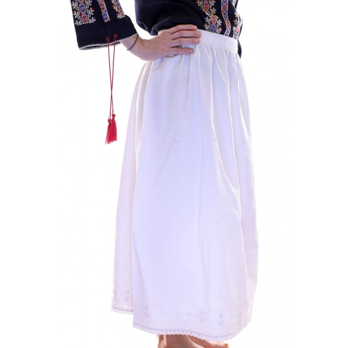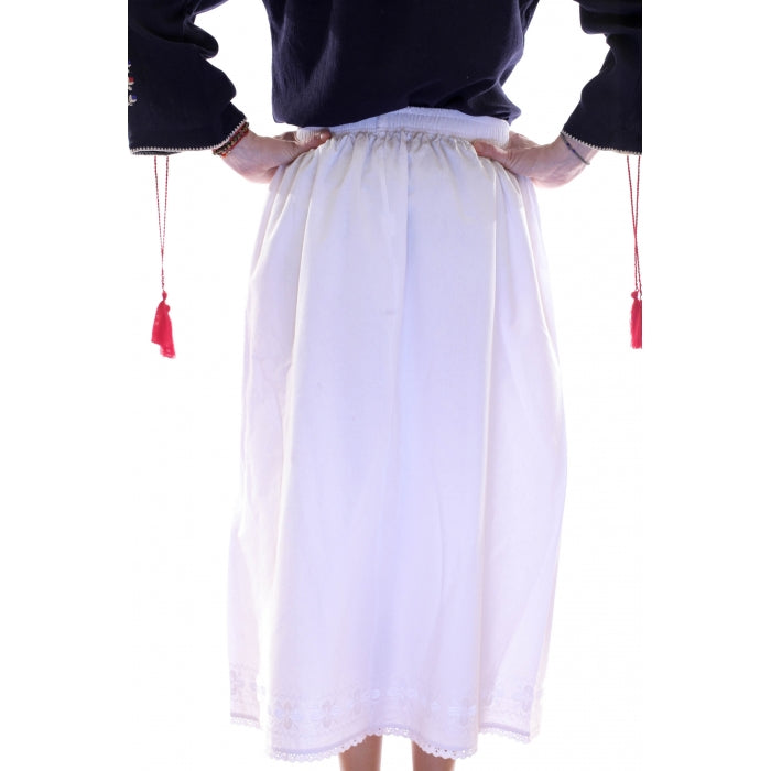 Fusta cu model traditional romanesc brodat la masina, cu elastic in talie, necaptusita, din bumbac 100%.