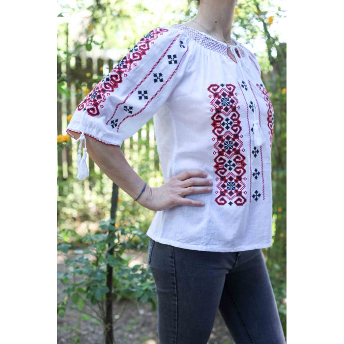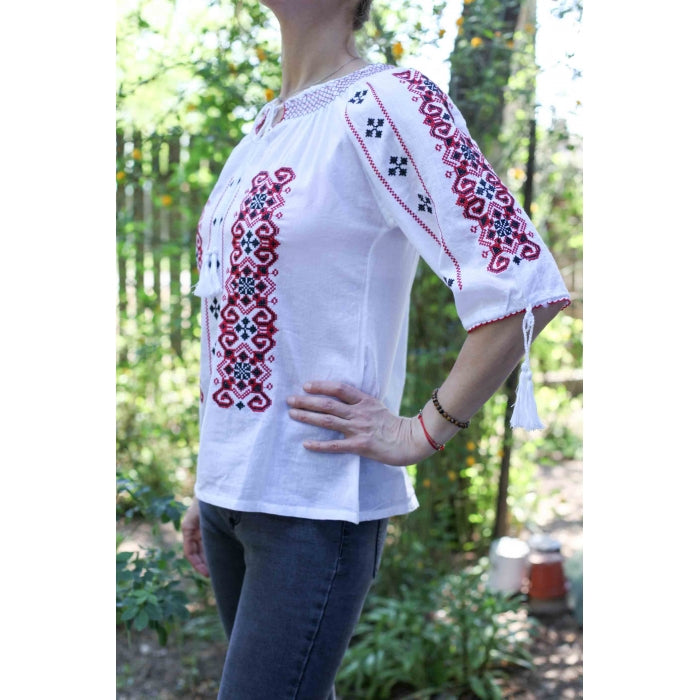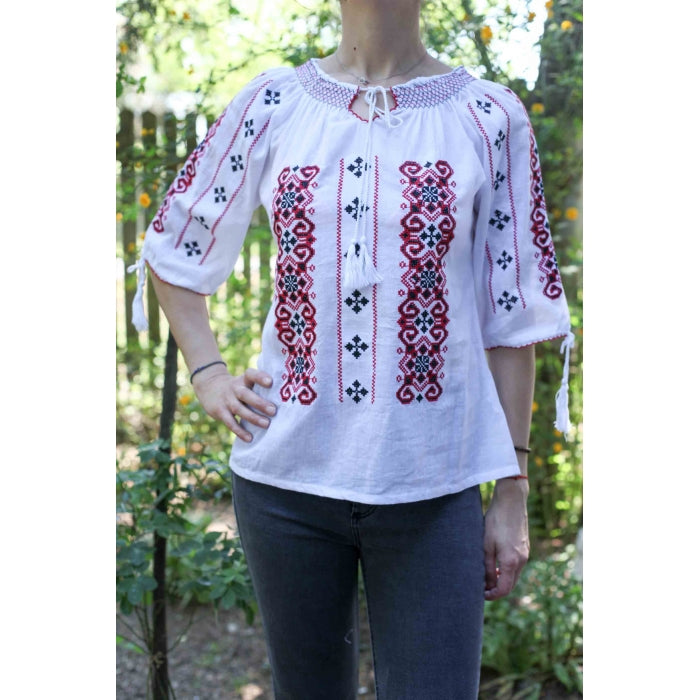 Ie romaneasca cu model traditional brodat la masina. Compozitie bumbac 100%.
