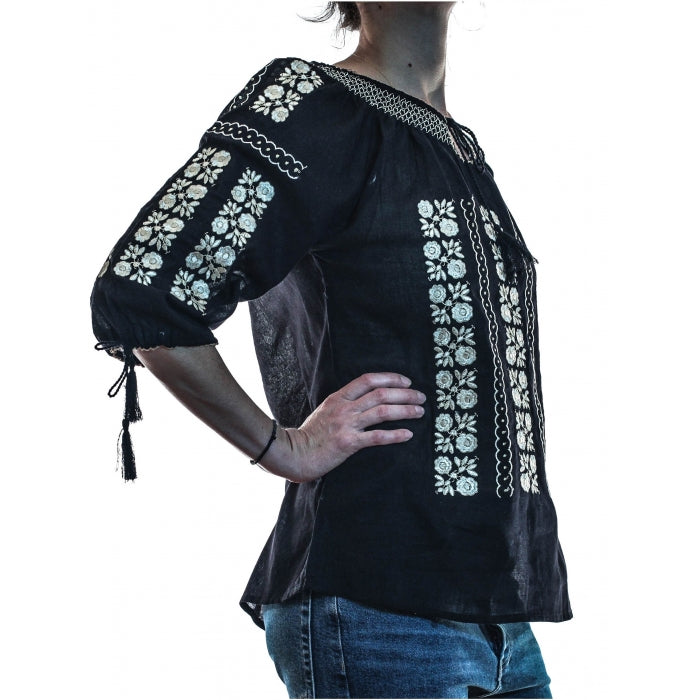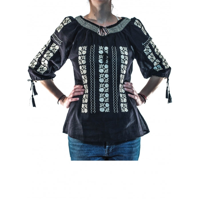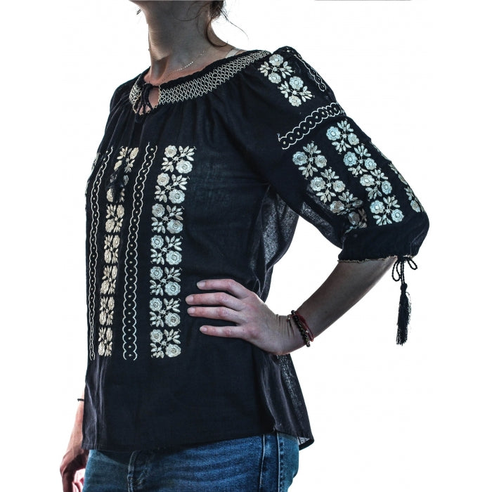 Ie romaneasca cu model traditional brodat la masina. Compozitie bumbac 100%.
