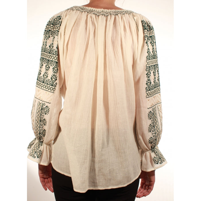 Ie brodata manual cu motivul Creasta Cocosului care simbolizeaza suisurile si coborasurile vietii toate aliniate intr-o forma bine definita, perfect dreapta la interior pentru atragerea echilibrului spiritual si al fortei interioare.
