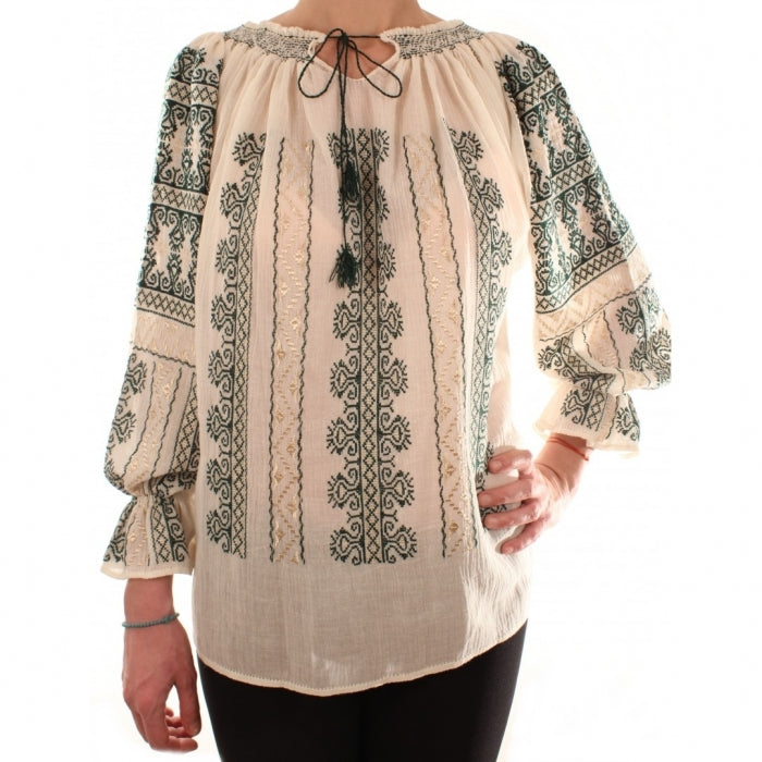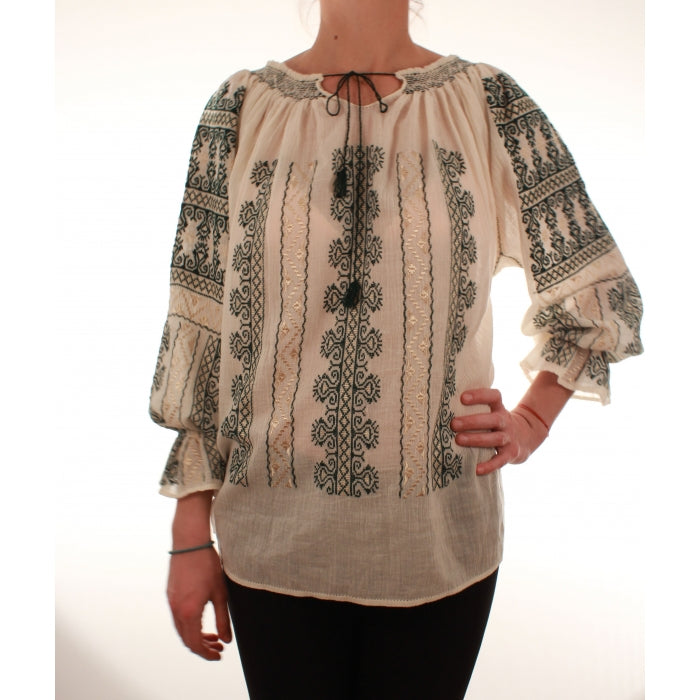 Ie romaneasca populara traditionala, din panza topita, subtire, cu maneca lunga, cusuta manual.