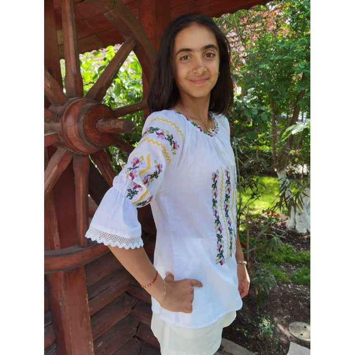 Ie Tradițională Alba din Bumbac cu Broderie Florala2 – Mâneci Trei Sferturi