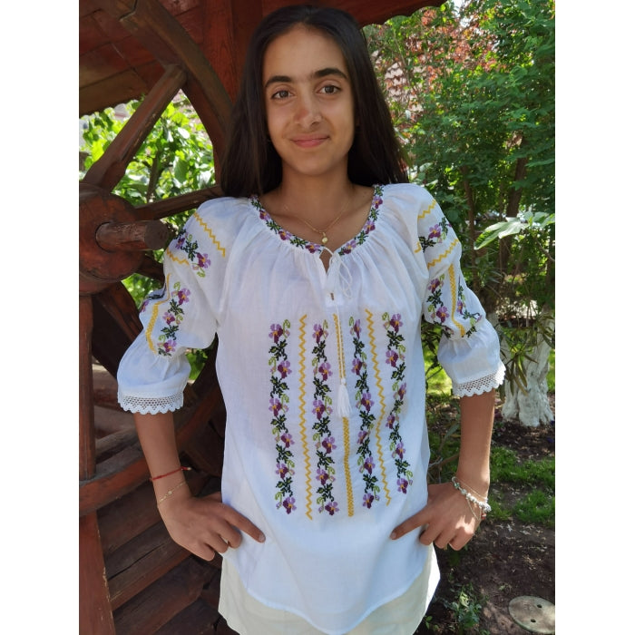 Această ie tradițională albă este un omagiu adus portului românesc autentic, reinterpretat într-o formă modernă și comodă. Confectionată din bumbac 100% moale și respirabil, ia este decorată cu broderii elegante, de inspirație geometrică sau florală, realizate cu migală. Mâneca trei sferturi adaugă un plus de rafinament și ușurință în purtare, fiind potrivită atât pentru evenimente tradiționale, cât și pentru ținute casual-chic.