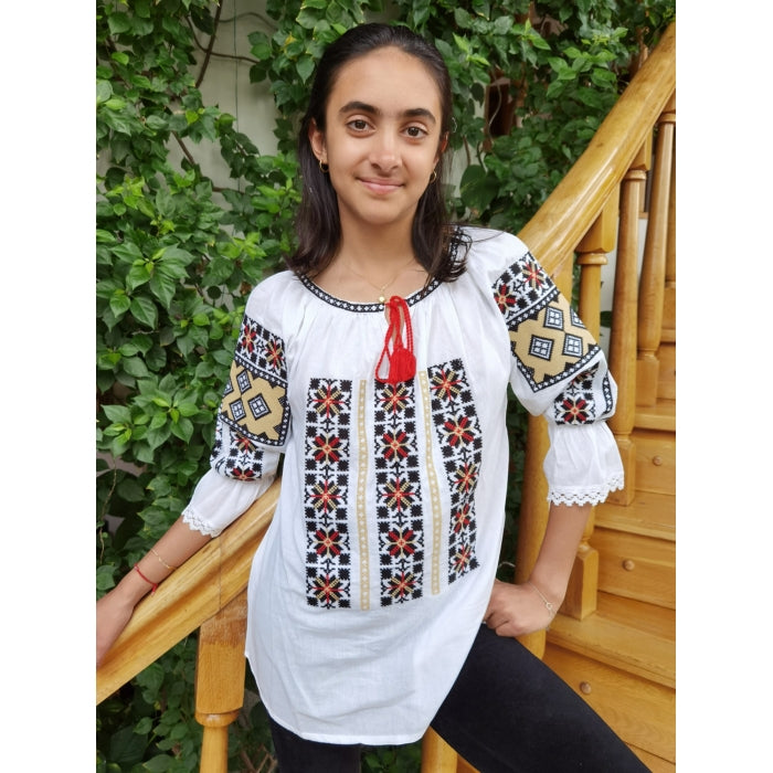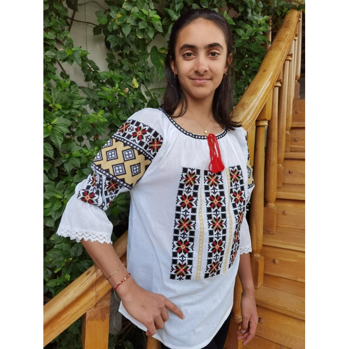 Această ie tradițională albă este un omagiu adus portului românesc autentic, reinterpretat într-o formă modernă și comodă. Confectionată din bumbac 100% moale și respirabil, ia este decorată cu broderii elegante, de inspirație geometrică sau florală, realizate cu migală. Mâneca trei sferturi adaugă un plus de rafinament și ușurință în purtare, fiind potrivită atât pentru evenimente tradiționale, cât și pentru ținute casual-chic.