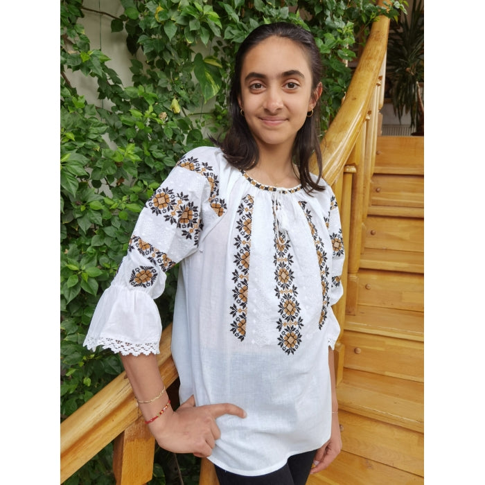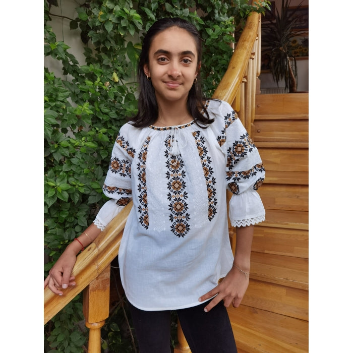 Ie Tradițională Albă din Bumbac cu Broderie Geometrică/Maro/Negru– Mâneci Trei Sferturi