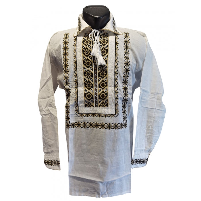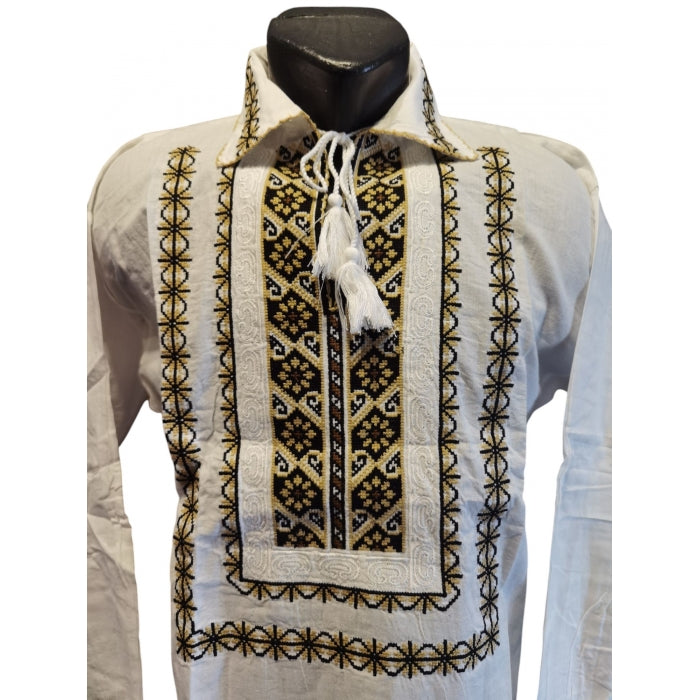 Această ie tradițională românească pentru bărbați aduce în prim-plan eleganța portului popular autentic. Realizată pe pânză albă din bumbac de calitate superioară, ia impresionează prin broderia geometrică specifică zonei Carpaților Meridionali, în nuanțe de negru și bej, cusături fine ce amintesc de înțelepciunea și meșteșugul românesc moștenit din generație în generație.