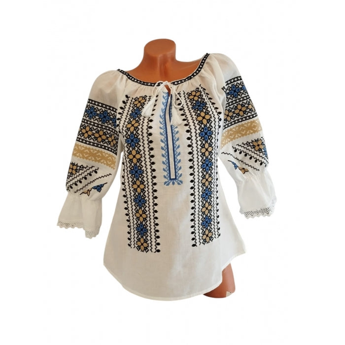 Reîntoarce-te la rădăcini cu această ie tradițională românească, lucrată cu măiestrie pentru a păstra farmecul autentic al portului popular. Confecționată din pânză albă de bumbac, ia este decorată cu broderii bogate, în motive geometrice tradiționale, în nuanțe elegante de albastru, negru și crem. Croiala lejeră și mânecile lungi cu terminații brodate aduc un plus de rafinament și confort.