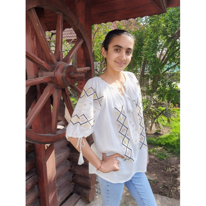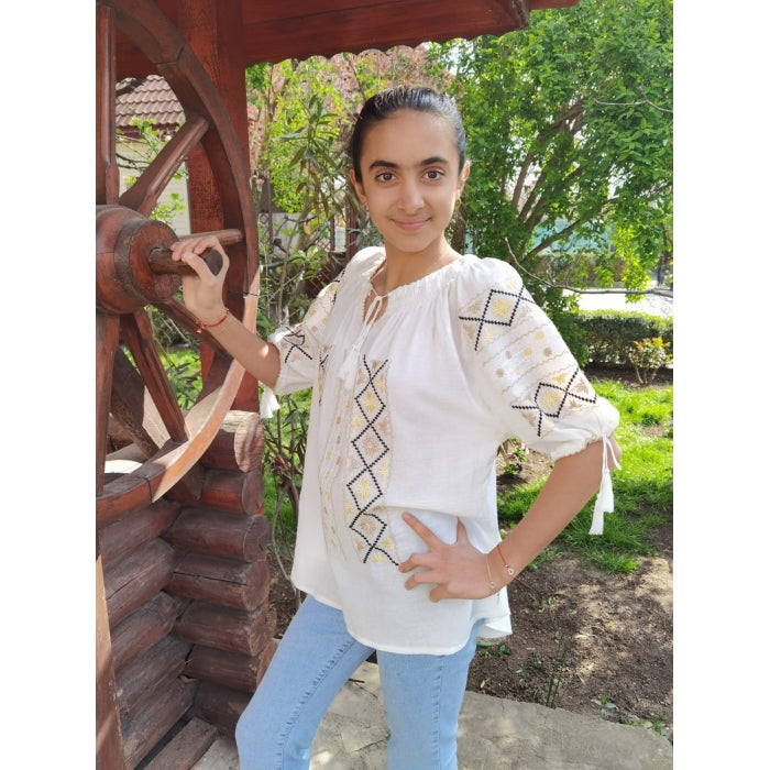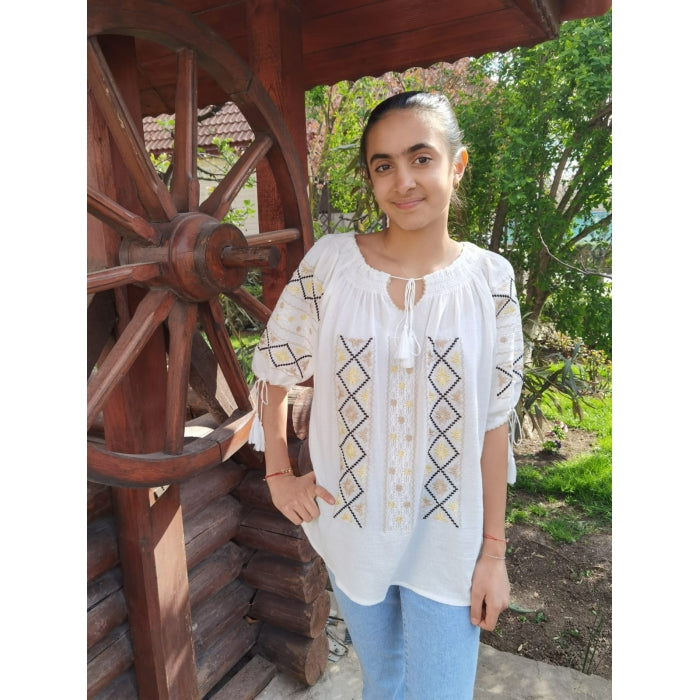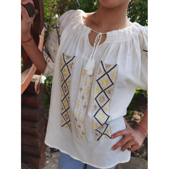 Această ie tradițională pentru damă, cu mânecă scurtă, este o piesă vestimentară autentică și versatilă, perfectă pentru zilele călduroase. Confectionată din bumbac 100% natural, ieșește în evidență prin broderia geometrică realizată cu migală în nuanțe elegante de galben pai, crem și negru, inspirate din motive tradiționale românești.