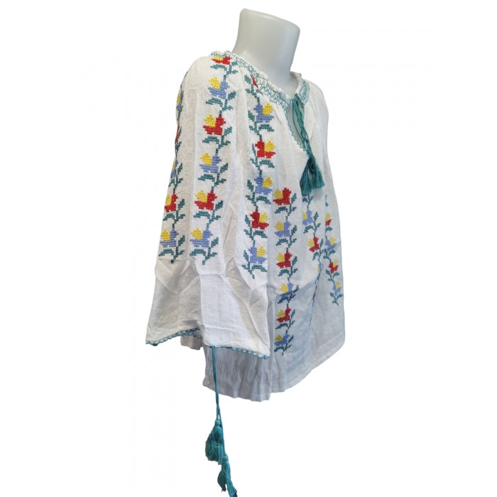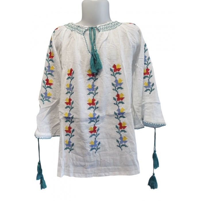 Această ie tradițională pentru fetițe este o piesă unică de vestimentație românească, realizată din bumbac de calitate superioară, moale și respirabil, ideal pentru pielea sensibilă a copiilor. Modelul este decorat cu broderie în stil autentic, având flori stilizate cusute în culori vii – roșu, galben, albastru – care aduc aminte de simbolurile străvechi ale fertilității și naturii.