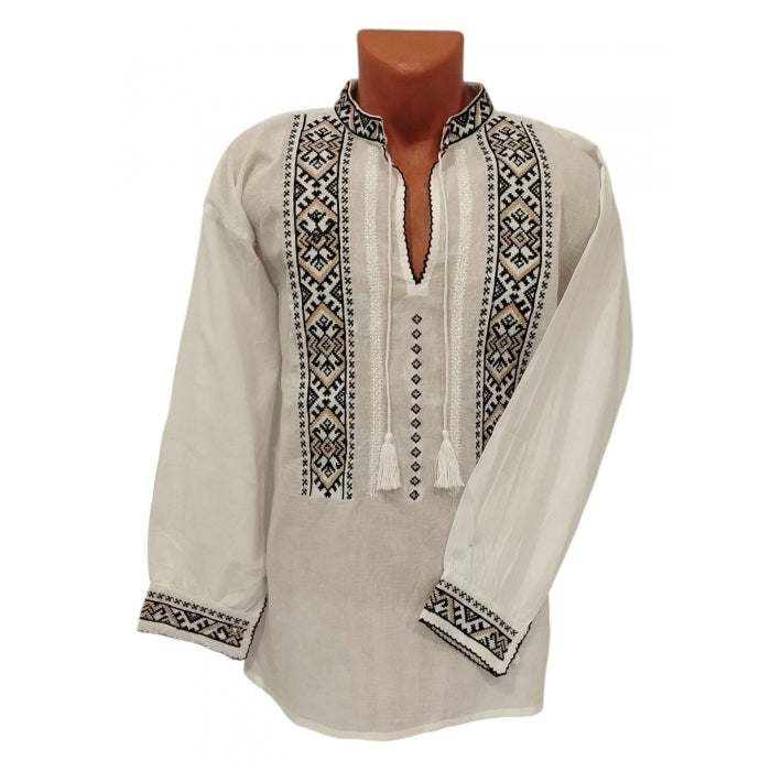 Ie Românească Tradițională cu guler tunica, Mâneci Lungi și Motive bej cu negru