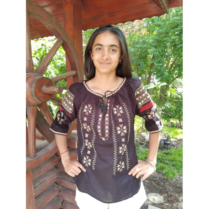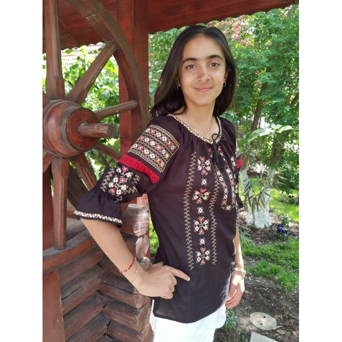 Ie Tradițională Neagra din Bumbac cu Broderie Florala2 – Mâneci Trei Sferturi