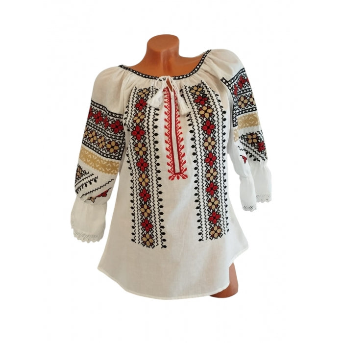 Descoperă frumusețea autentică a portului popular românesc cu această ie tradițională, brodată cu motive geometrice specifice zonelor istorice din România. Realizată din pânză albă de bumbac, ia impresionează prin broderiile bogate în culori tradiționale: roșu, negru și galben, care spun povești despre trecut, obiceiuri și meșteșuguri transmise din generație în generație.