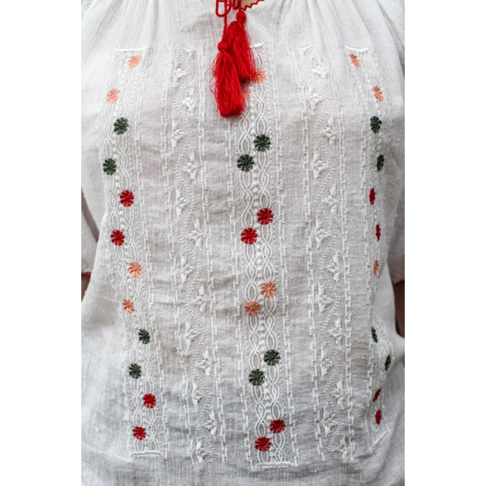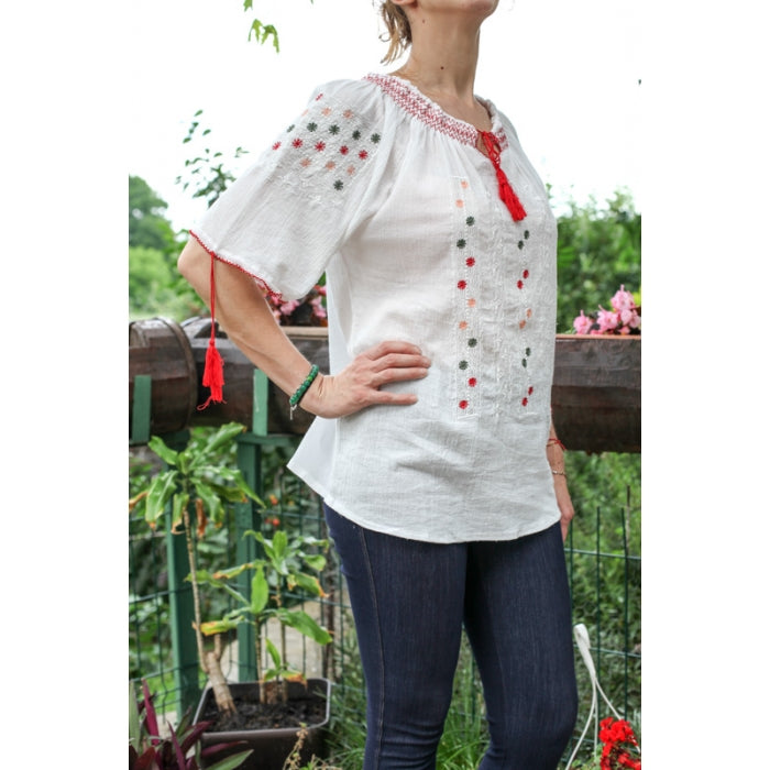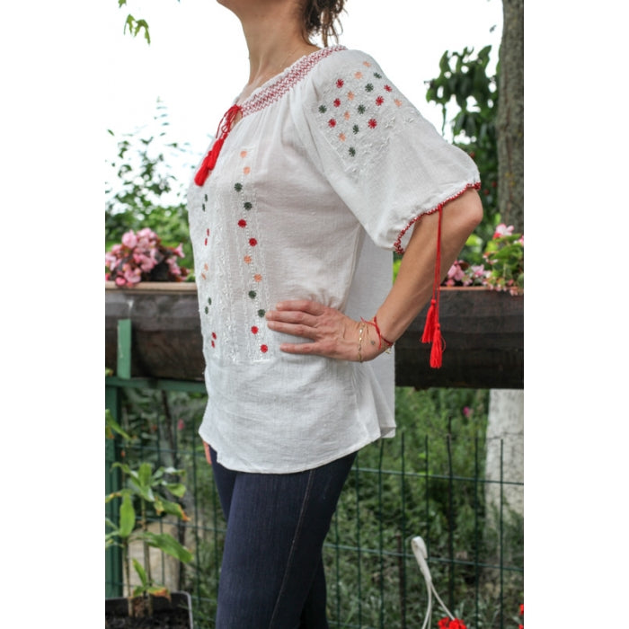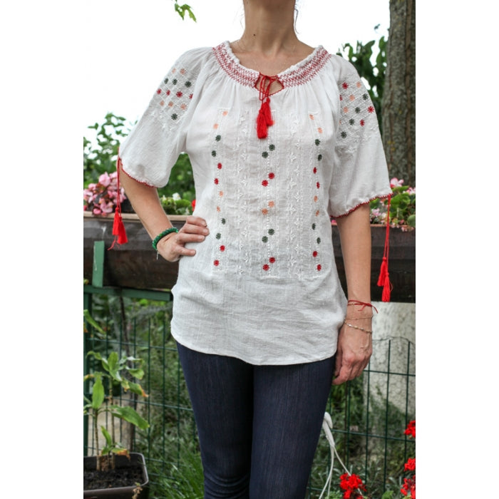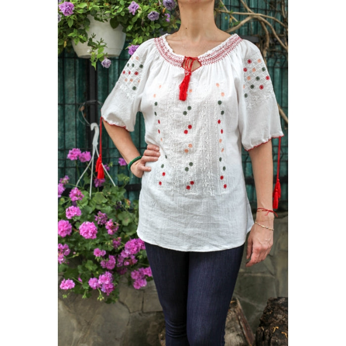 Ie Traditionala Romaneasca Stilizata brodata la masina cu fir de bumbac si fir de matase, pe panza topita din bumbac 100%. Produs in Romania.