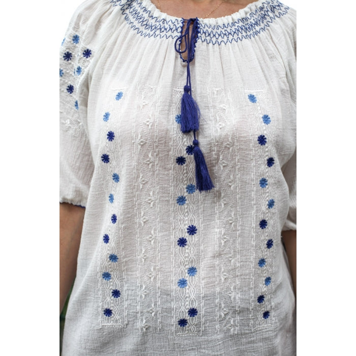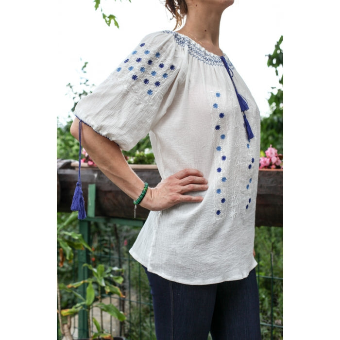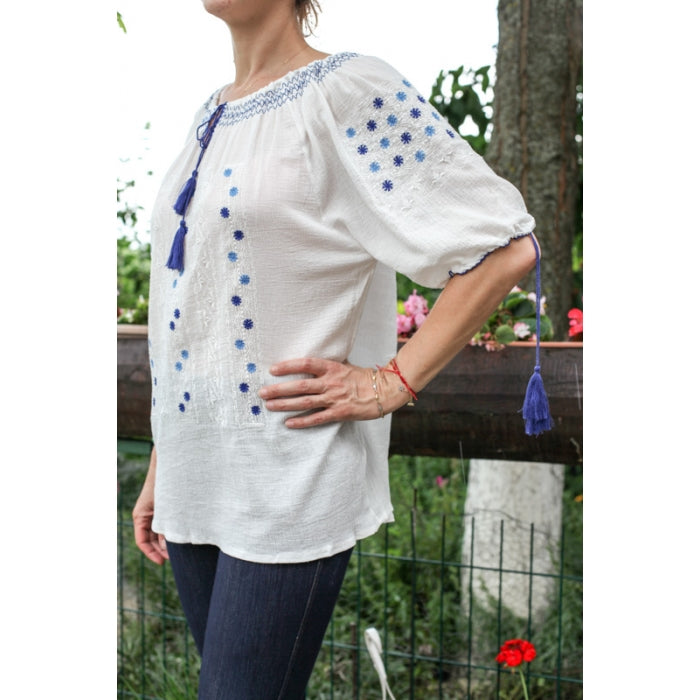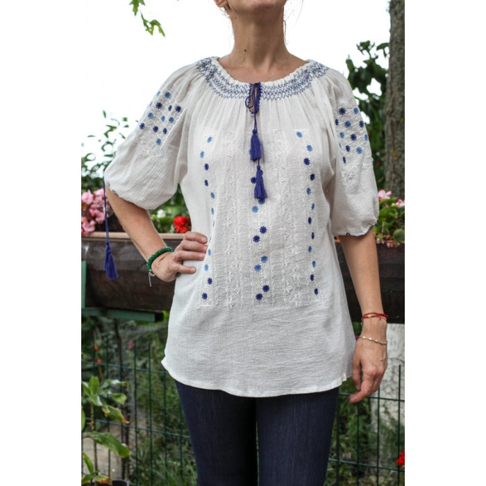 Ie Traditionala Romaneasca Stilizata brodata la masina cu fir de bumbac si fir de matase, pe panza topita din bumbac 100%. Produs in Romania.
