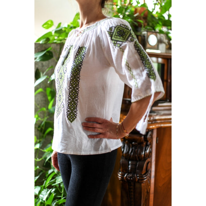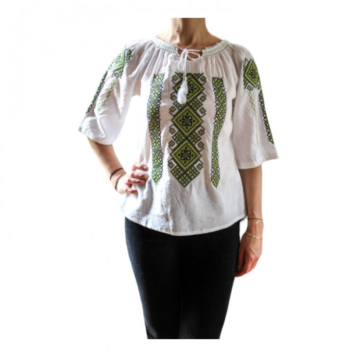Panza plina, netransparenta, broderie bogata, iesita in relief si maneci trei sferturi - aceasta ie romaneasca stilizata este o achizitie perfecta pentru garderoba ta.
