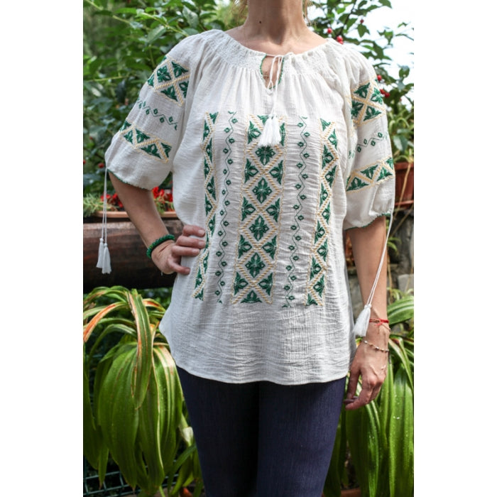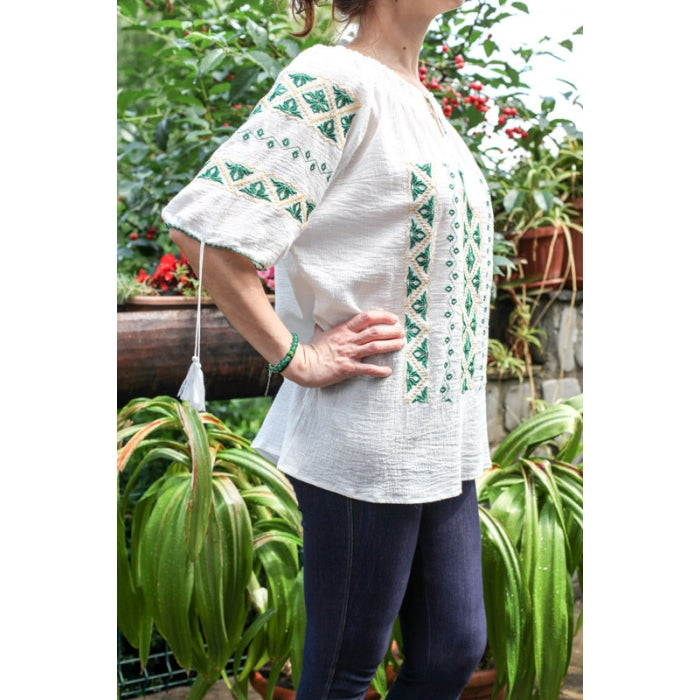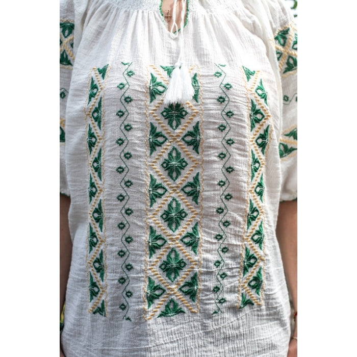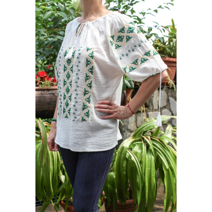 Ie Traditionala Romaneasca Stilizata brodata la masina cu fir de bumbac si fir de matase, pe panza topita din bumbac 100%. Produs in Romania.