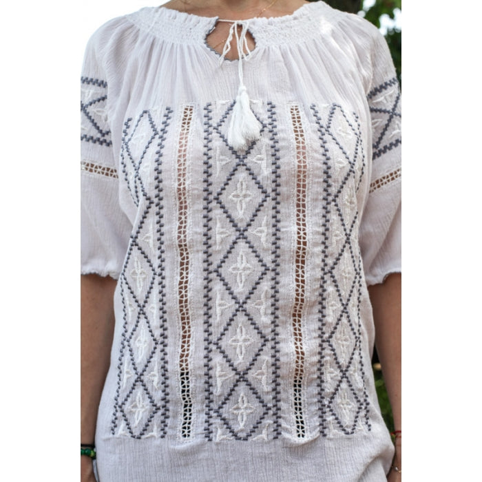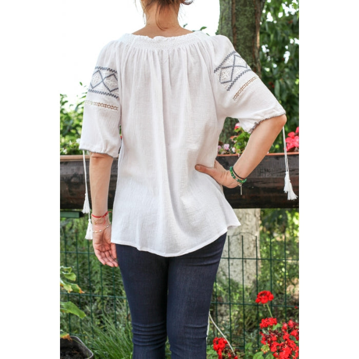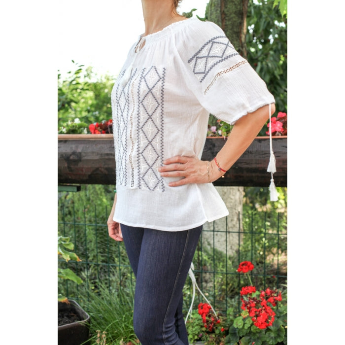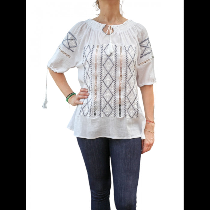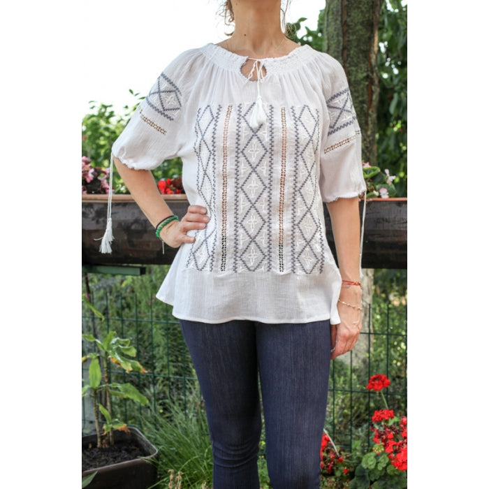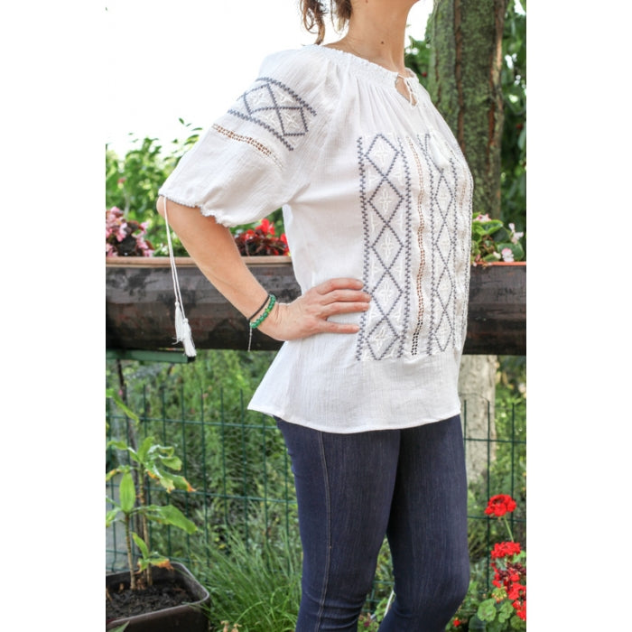 Ie Traditionala Romaneasca Stilizata brodata la masina cu fir de bumbac si fir de matase, pe panza topita din bumbac 100%. Produs in Romania.