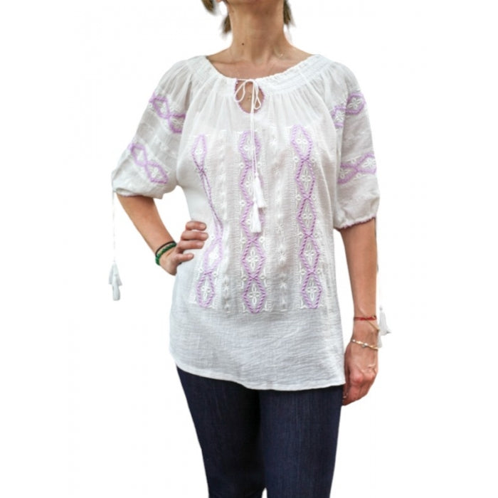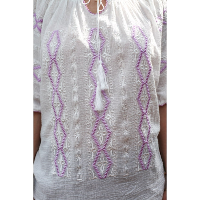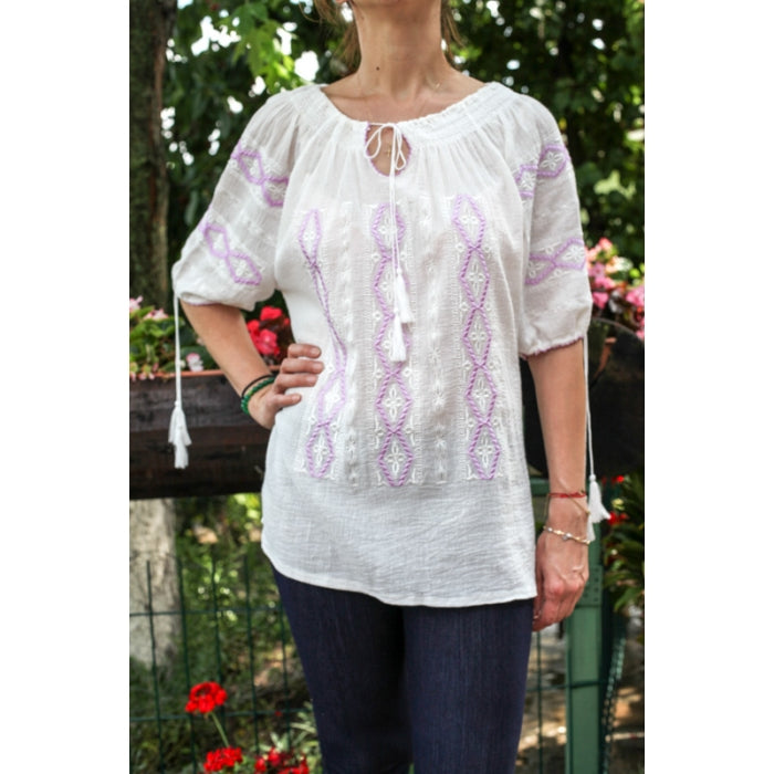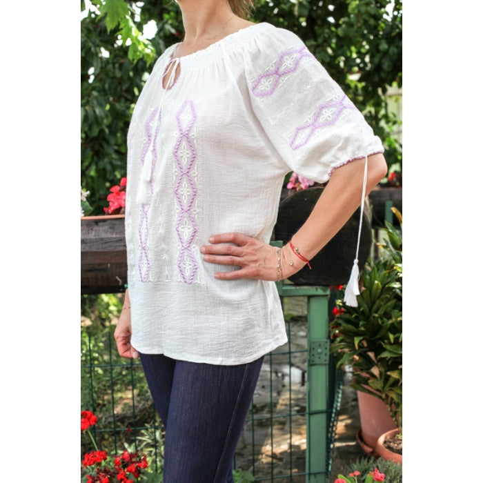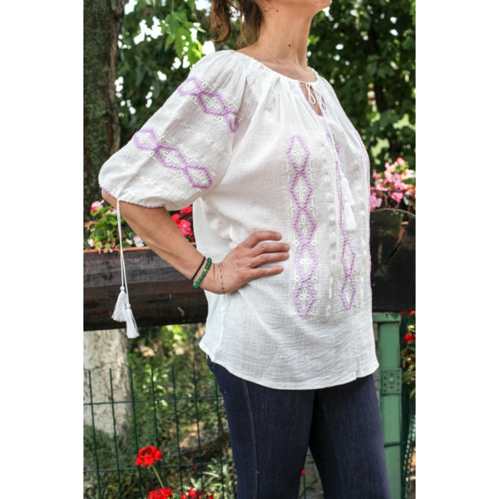 Ie Traditionala Romaneasca Stilizata brodata la masina cu fir de bumbac si fir de matase, pe panza topita din bumbac 100%. Produs in Romania.