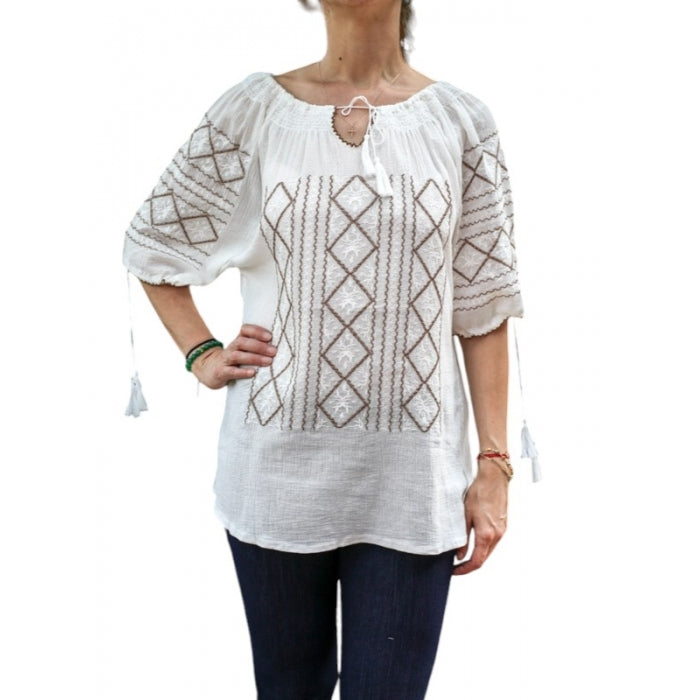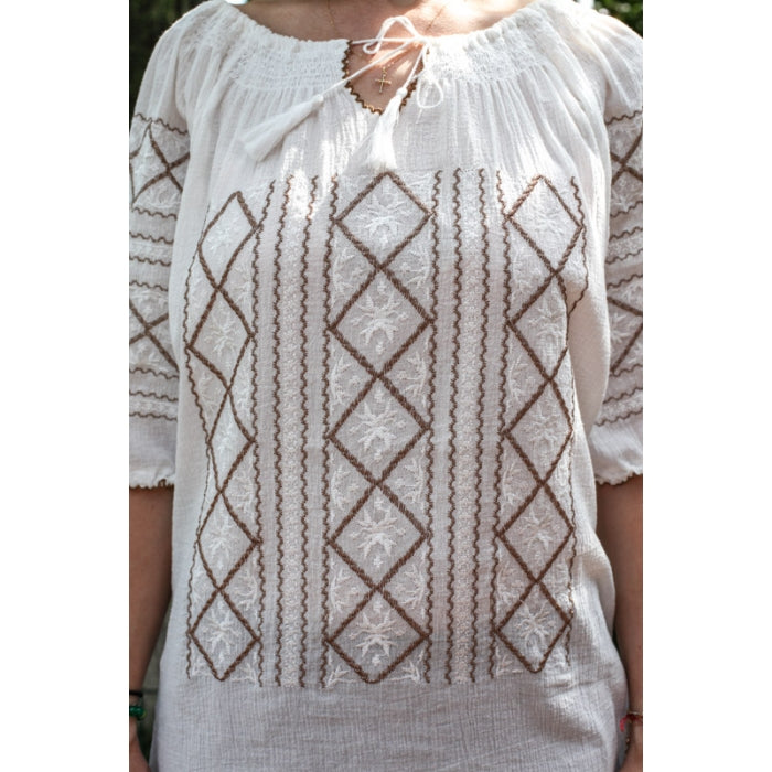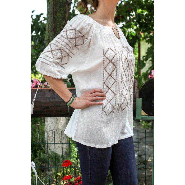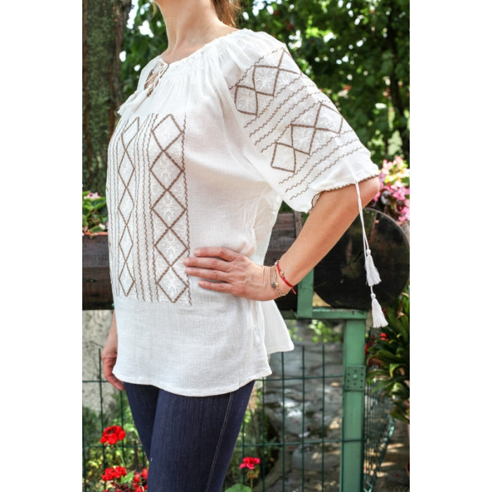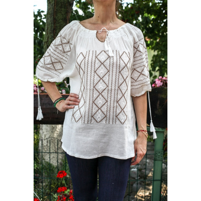 Ie Traditionala Romaneasca Stilizata brodata la masina cu fir de bumbac si fir de matase, pe panza topita din bumbac 100%. Produs in Romania.