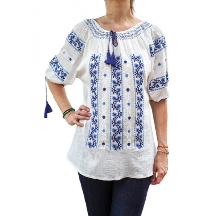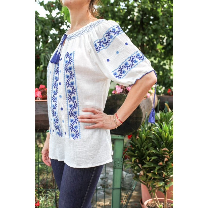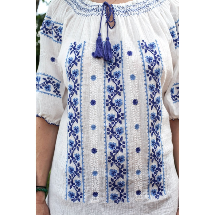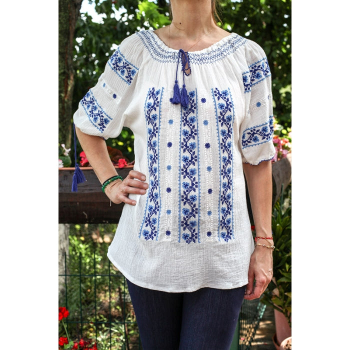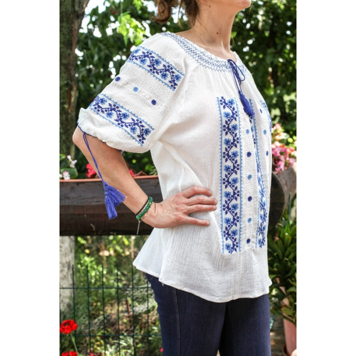 Ie Traditionala Romaneasca Stilizata brodata la masina cu fir de bumbac si fir de matase, pe panza topita din bumbac 100%. Produs in Romania.