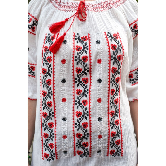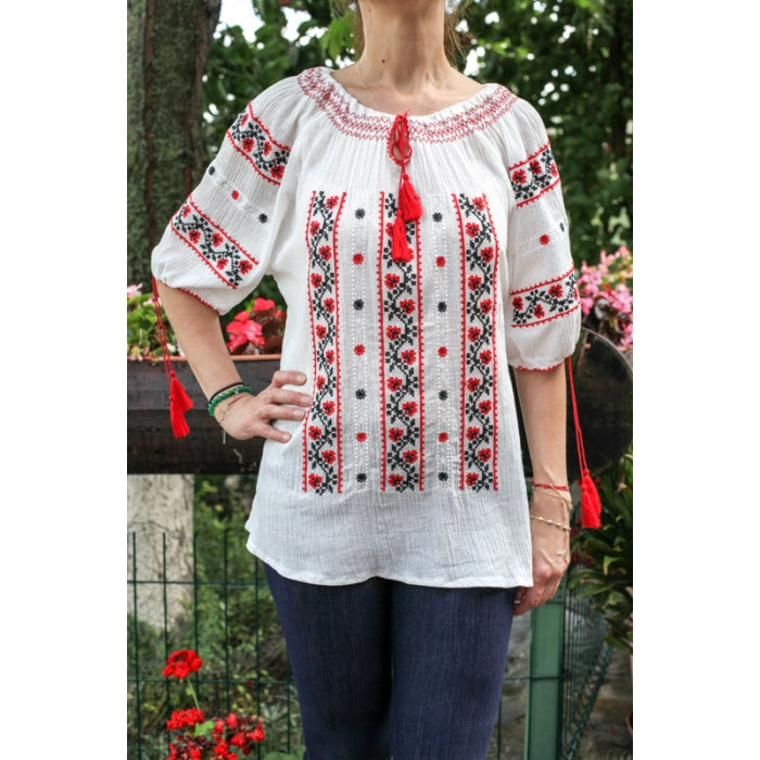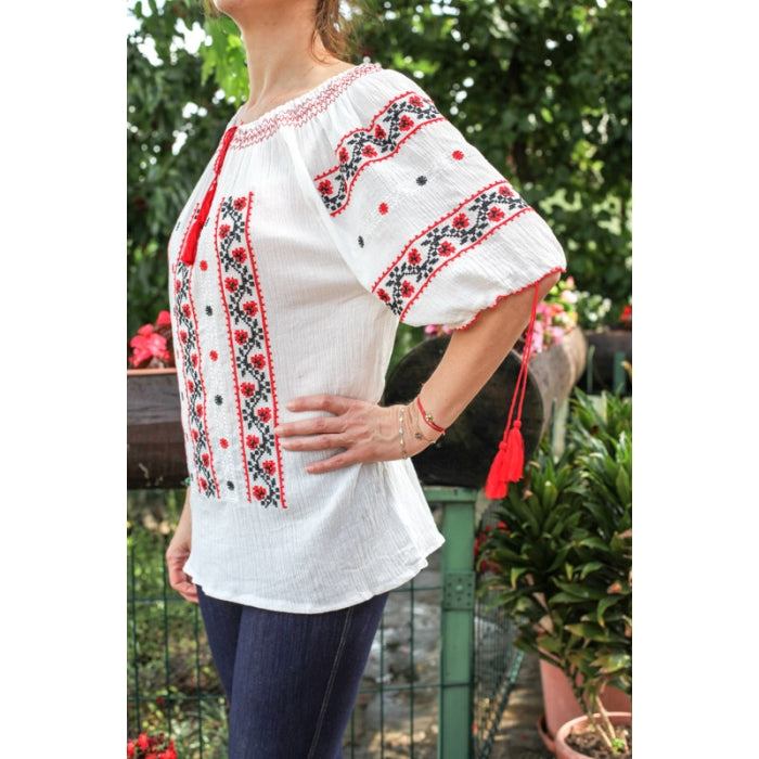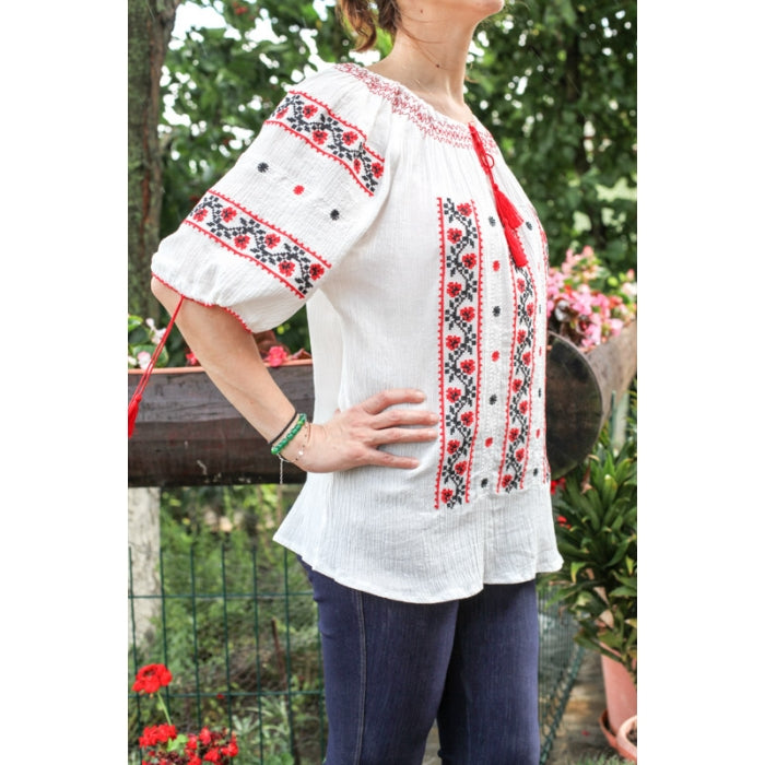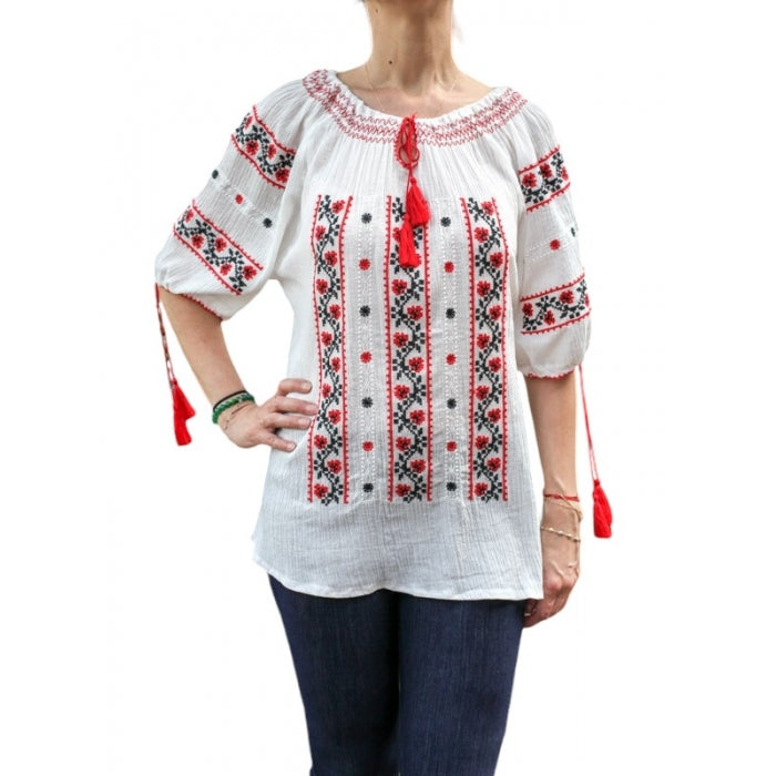 Ie Traditionala Romaneasca Stilizata brodata la masina cu fir de bumbac si fir de matase, pe panza topita din bumbac 100%. Produs in Romania.