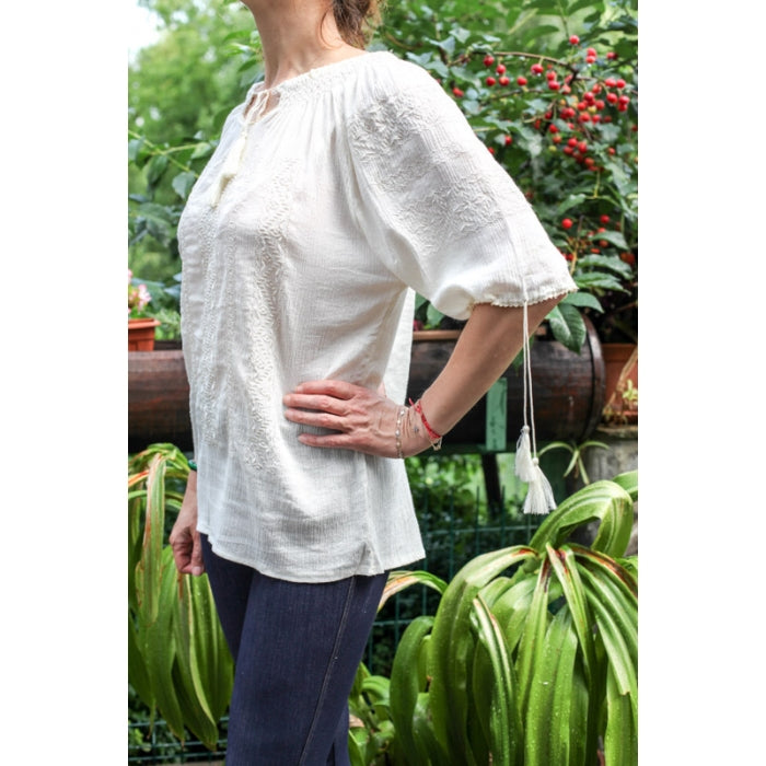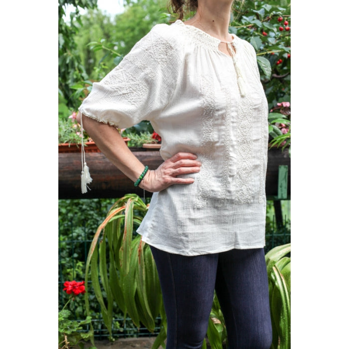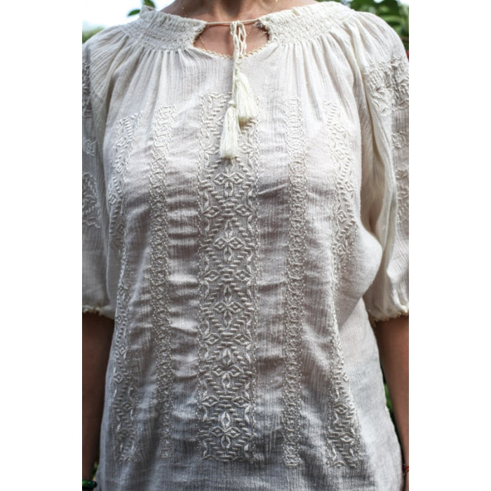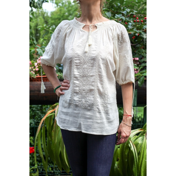 Ie Traditionala Romaneasca Stilizata brodata la masina cu fir de bumbac si fir de matase, pe panza topita din bumbac 100%. Produs in Romania.