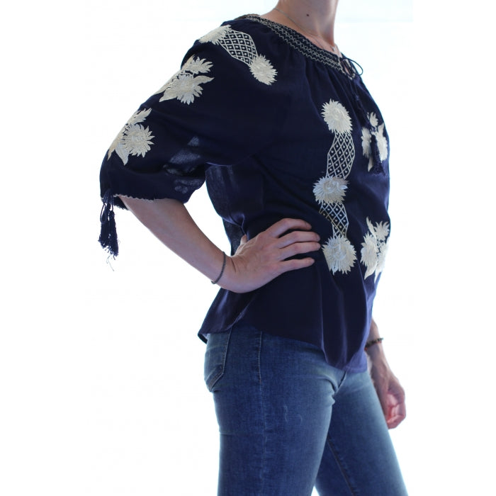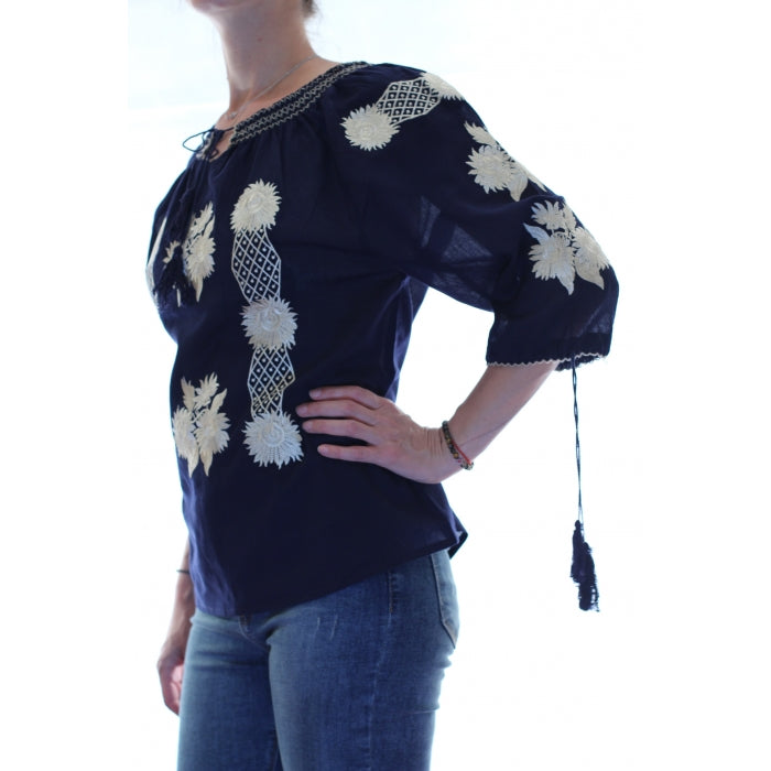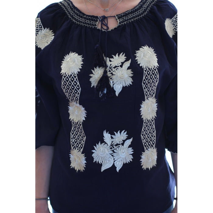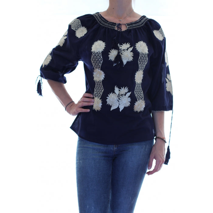 Ie romaneasca brodata cu motive romanesti traditionale. Culori disponibile: negru si bleumarin