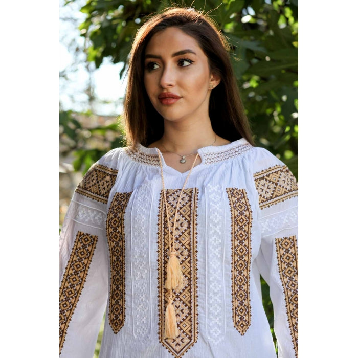 Ie traditionala brodata cu elemente naturale bogate si stralucitoare. O ie romaneasca stilizata deosebita, plina de culoare si rafinament. Delicatetea broderiei, puritatea materialului o fac o piesa de rezistenta in orice garderoba. Comanda acum ianationala!