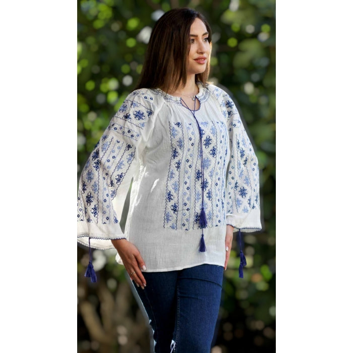 Ie traditionala brodata cu elemente naturale bogate si stralucitoare. O ie romaneasca stilizata deosebita, plina de culoare si rafinament. Delicatetea broderiei, puritatea materialului o fac o piesa de rezistenta in orice garderoba. Comanda acum ianationala!