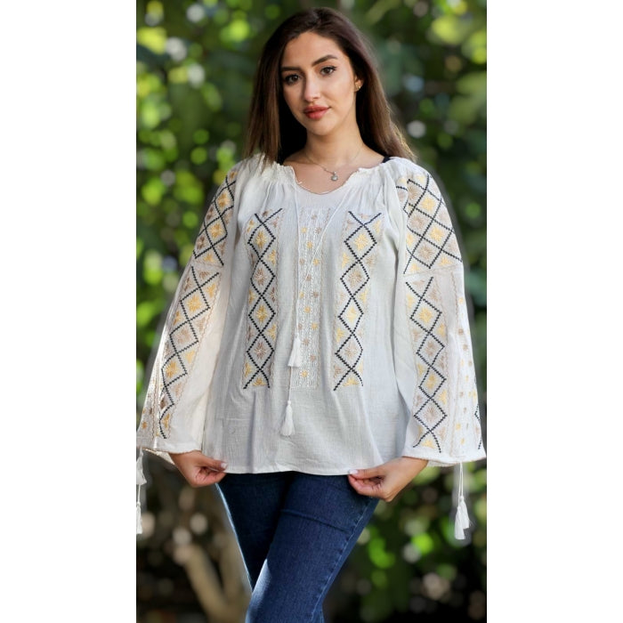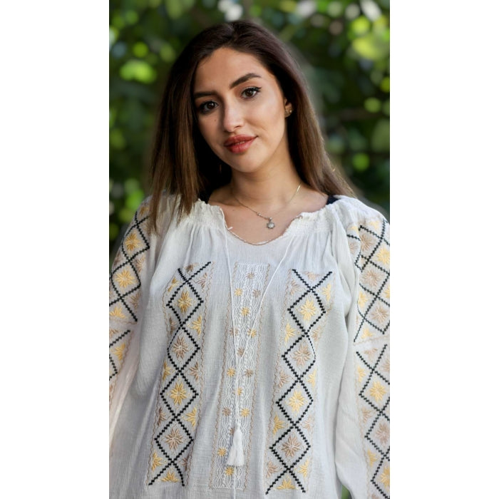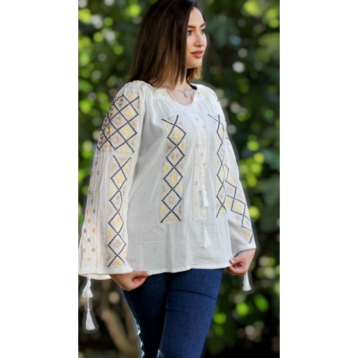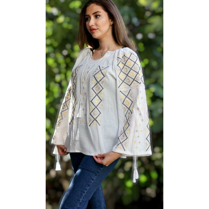 Ie traditionala brodata cu elemente naturale bogate si stralucitoare. O ie romaneasca stilizata deosebita, plina de culoare si rafinament. Delicatetea broderiei, puritatea materialului o fac o piesa de rezistenta in orice garderoba. Comanda acum ianationala!