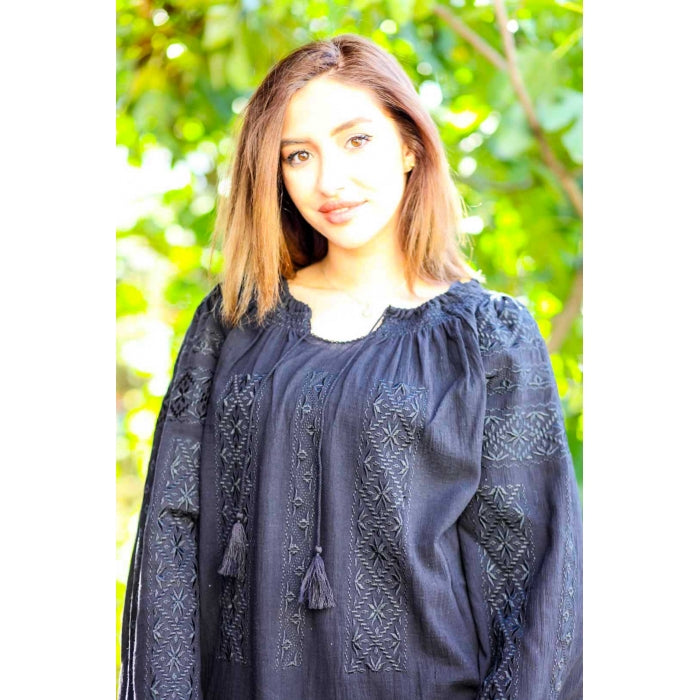Panza plina, netransparenta, broderie bogata, iesita in relief si maneci trei sferturi - aceasta ie romaneasca stilizata este o achizitie perfecta pentru garderoba ta.