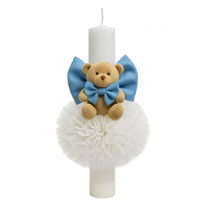 Lumânare botez băiețel cu ursuleț de pluș și fundă albastră – 40 cm