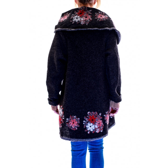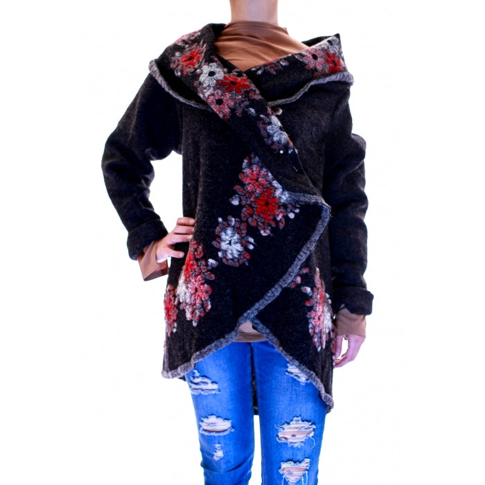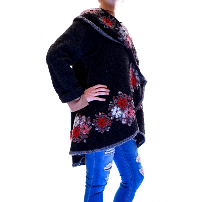 Poncho din lana cu maneci si model floral, material 80% lana, 20% poliester. Marime universala: 85 cm lungime.