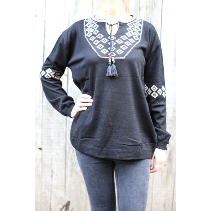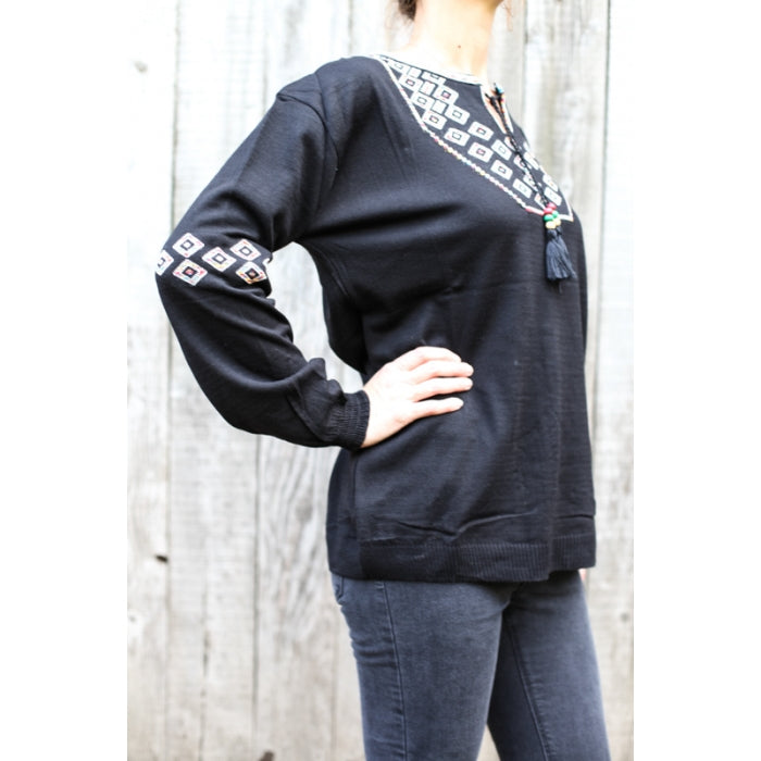 - Pulover din tricot cu motive stilizate traditionale romanesti. Marime universala.