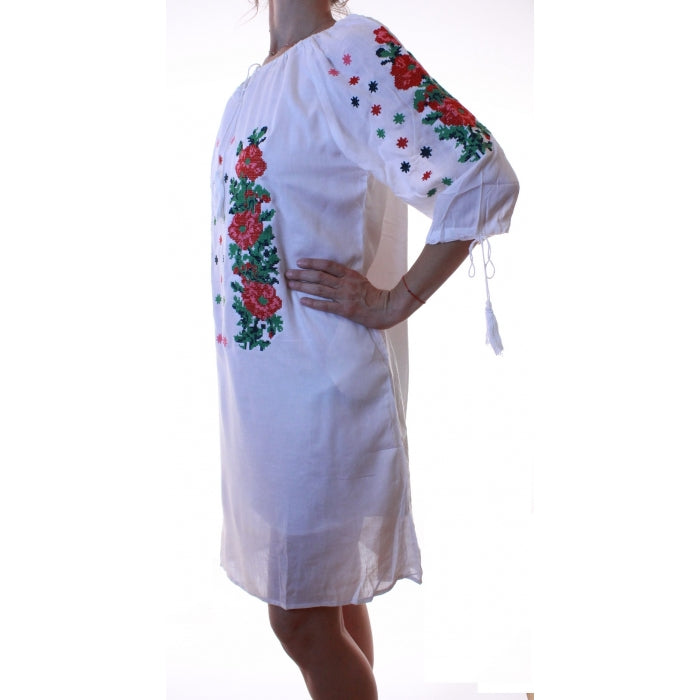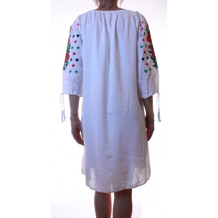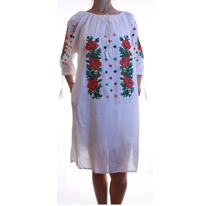 Rochie midi, din bumbac creponat, cu broderie cusuta la masina si capuseala.