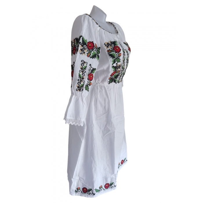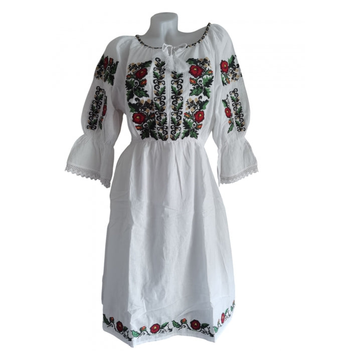 Redescoperă farmecul autentic românesc purtând această rochie tradițională albă, împodobită cu broderii florale inspirate din motivele populare strămoșești. Croiala lejeră și materialul natural din bumbac oferă confort și eleganță, fiind ideală pentru evenimente tradiționale, sărbători sau pur și simplu pentru a aduce un strop de autenticitate în ținutele tale zilnice.