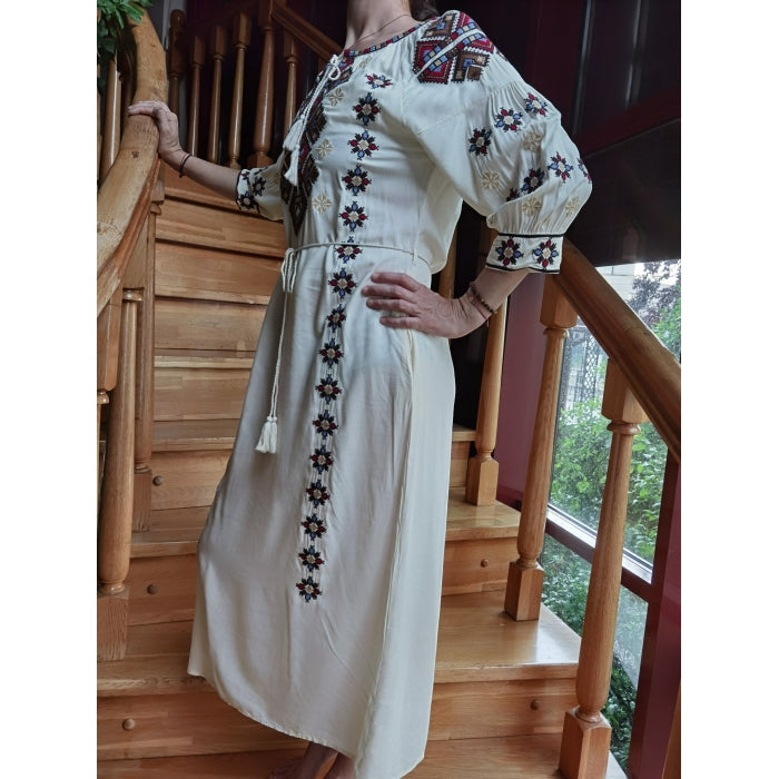 rochie tradițională românească, rochie cu broderie multicoloră, rochie etnică femei, rochie lungă tradițională, rochie cu cordon și ciucuri, rochie stil ie